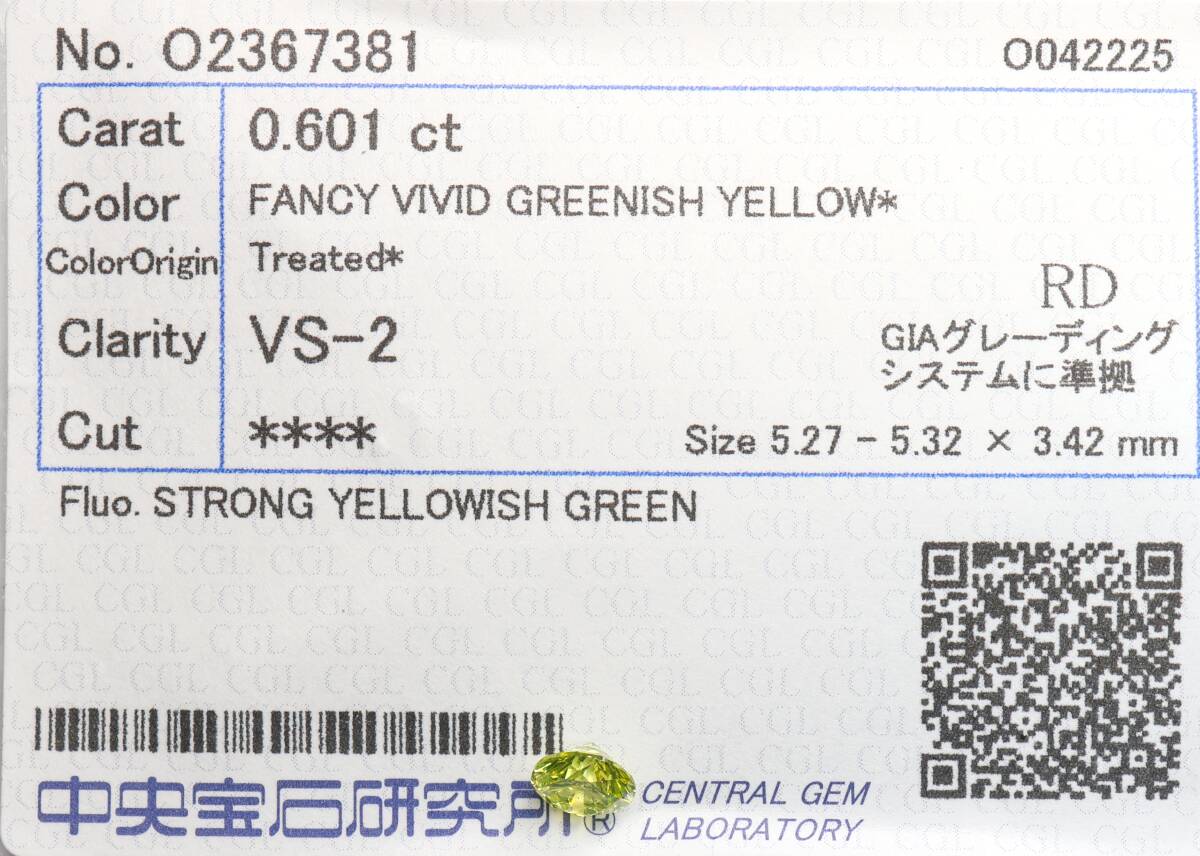 Product name: 【100円~】VS2!0.601ct 天然ダイヤ FANCY VIVID GREENISH YELLOW(トリート)RD
