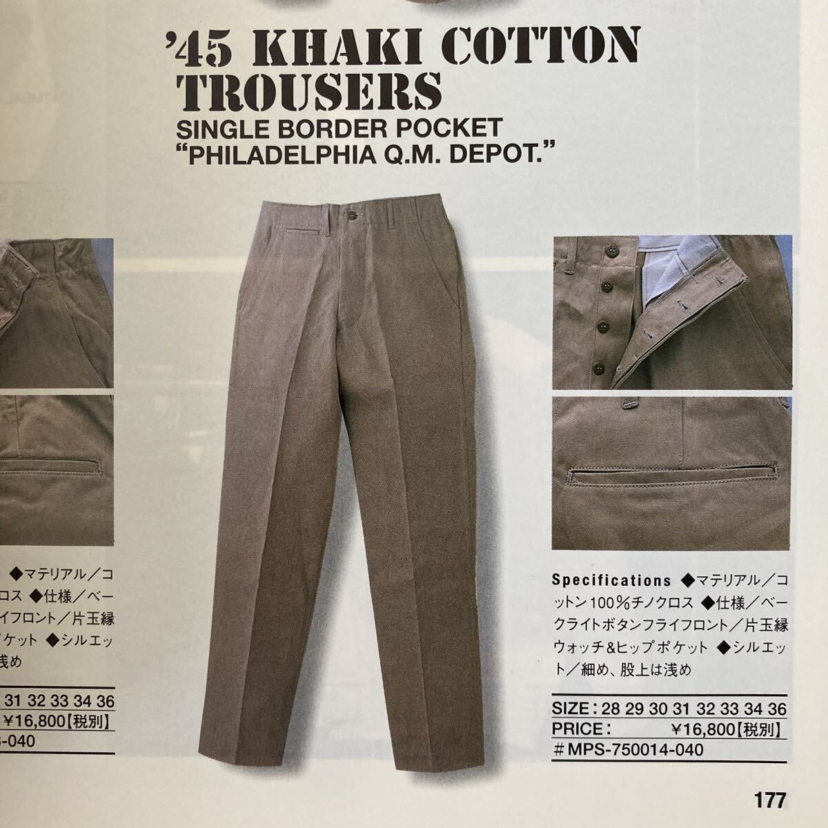 コットンツイル生地、ボタンフライ、ダブルステッチ、ポケットは片玉縁、付属品あります。