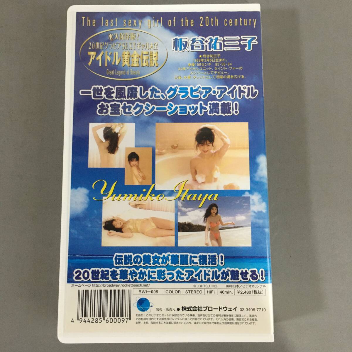 The last sexy girl of the 20th century 水人旅! 20世紀グラビア SEXYギャル大全 アイドル黄金伝説 Great Legend of Beauty 板谷祐三子 ★板谷祐三子 1968年3月5日生まれ。 身長156センチ 825684 84年アイドルユニット、 セイント・フォーの メンバーとしてデビュー。 以後、女優・タレントとして活躍の場を広げる。 一世を風靡した、グラビア・アイドル お宝セクシーショット満載! Yumiko Maya 伝説の美女が華麗に復活! 20世紀を華やかに彩ったアイドルが魅せる! ホームページ http://broadway.rocketbeach.net/ JOHTSU. INC 00年日本/ビデオオリジナル BWI-009 COLOR STEREO HiFi 40min. ¥2,480 (税抜) 4 944285 600097 発売・販売元 株式会社ブロードウェイ 03-3406-7710 お断り このビデオカセットに収録されている映像、音声及び全ての権利は著作権者に留保され、家庭内 での利用を目的とする販売及びレンタルに限って許諾されています。 それ以外の使用、 無断でこれを複製、 変更、 上映、放映することは厳に禁止されており、 違反した場合は民事罰及び刑事罰が規定されています。
