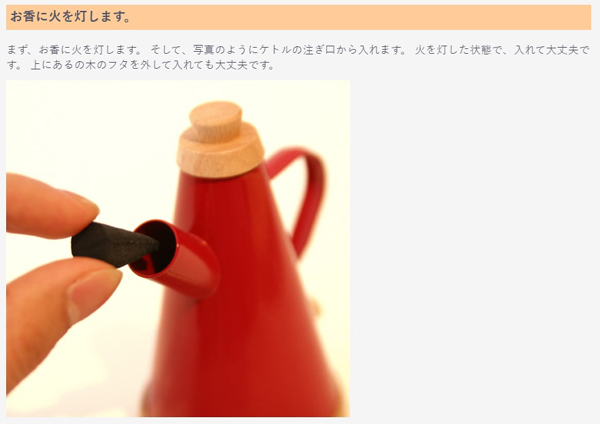 火を灯したお香を、注ぎ口からストンと入れるとセット完了。
