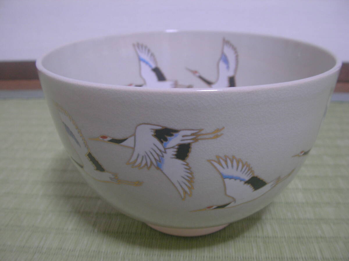 茶碗の胴と見込みに鶴をあしらい、奥行きを表現したデザインです。