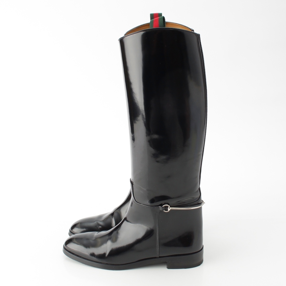 グッチ シャイニーレザー スリム シェリーライン ホースビット ロング ブーツ 805310 ブラック 42【中古】