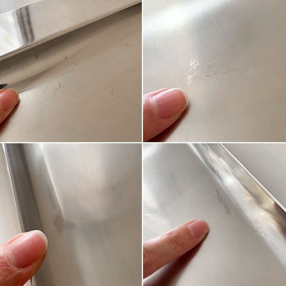 全体に擦れや傷、削れや打痕、黒ずみや水痕などの取り切れない汚れ等が散見されます。また、一部目立った線傷やスクラッチ傷が見受けられますが、ご使用に問題となるダメージはございません。やや使用感はあるものの今後も安心して実用いただけるコンディションを保っております。