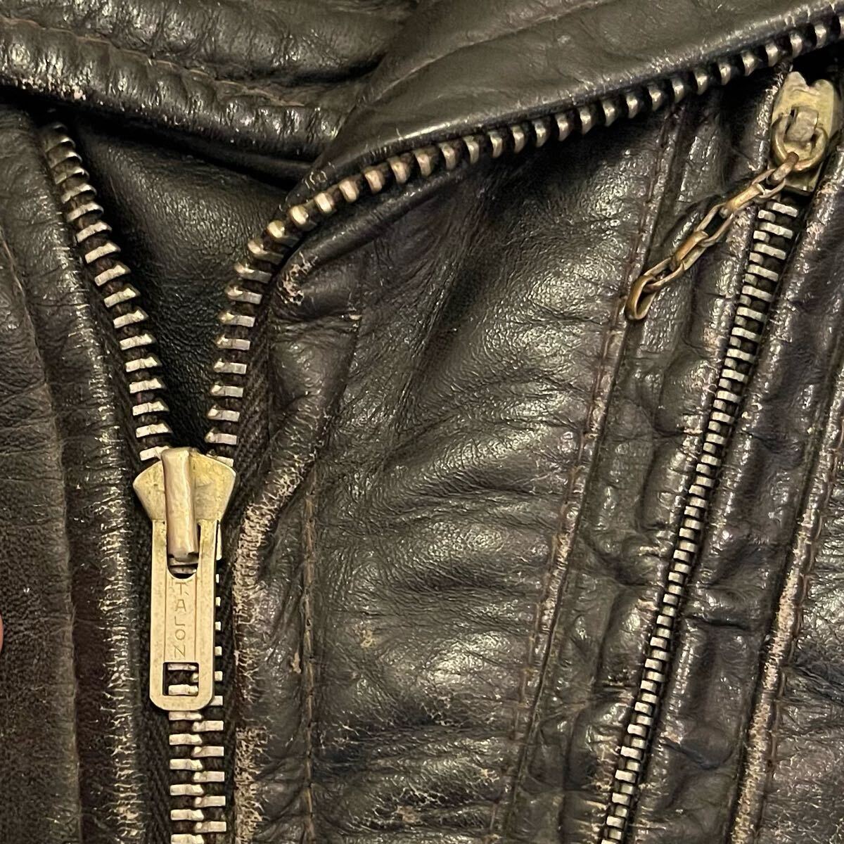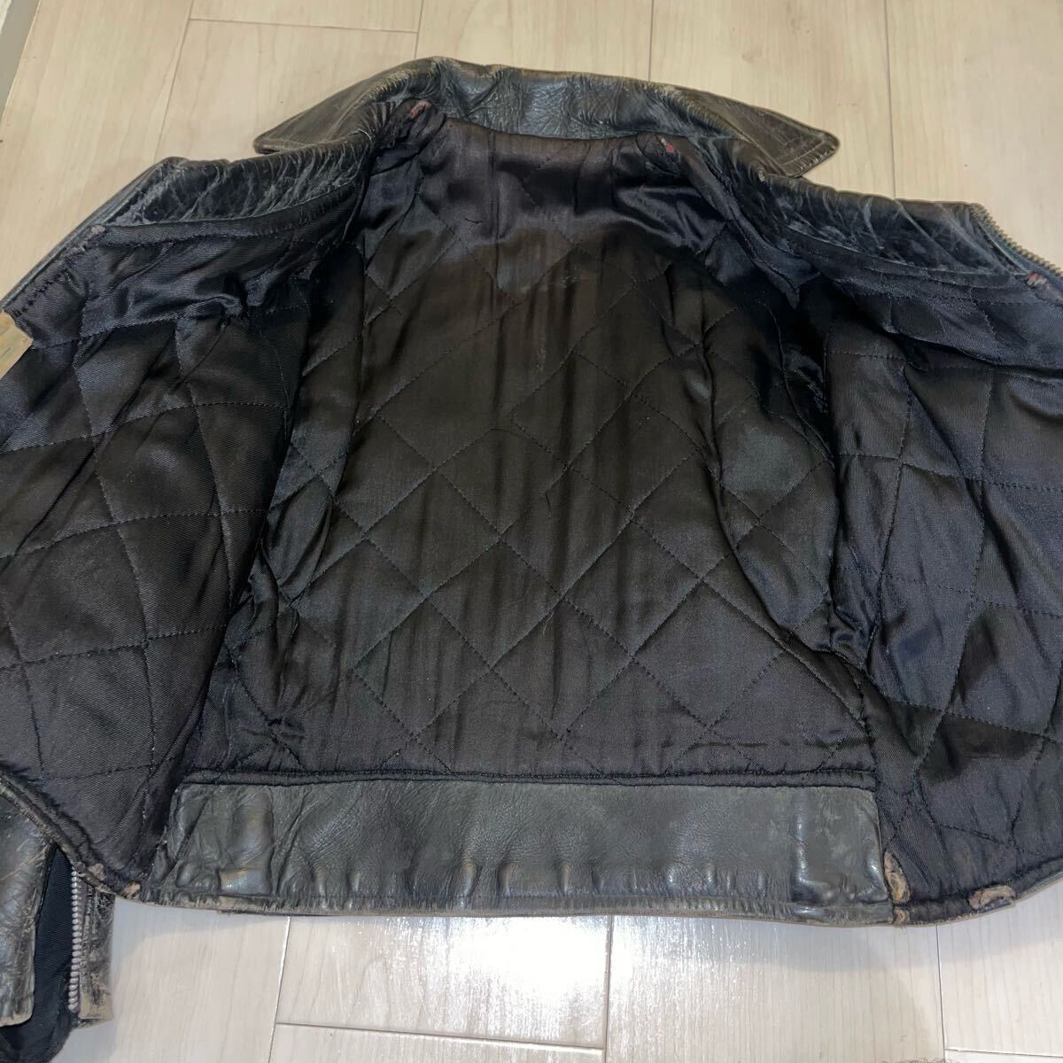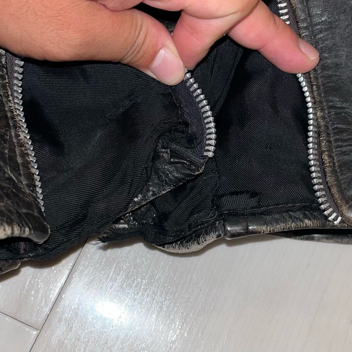 ヴィンテージレザー特有の着用感はありますが革質はしっかりしています。両袖先のライナーにほつれがあります。