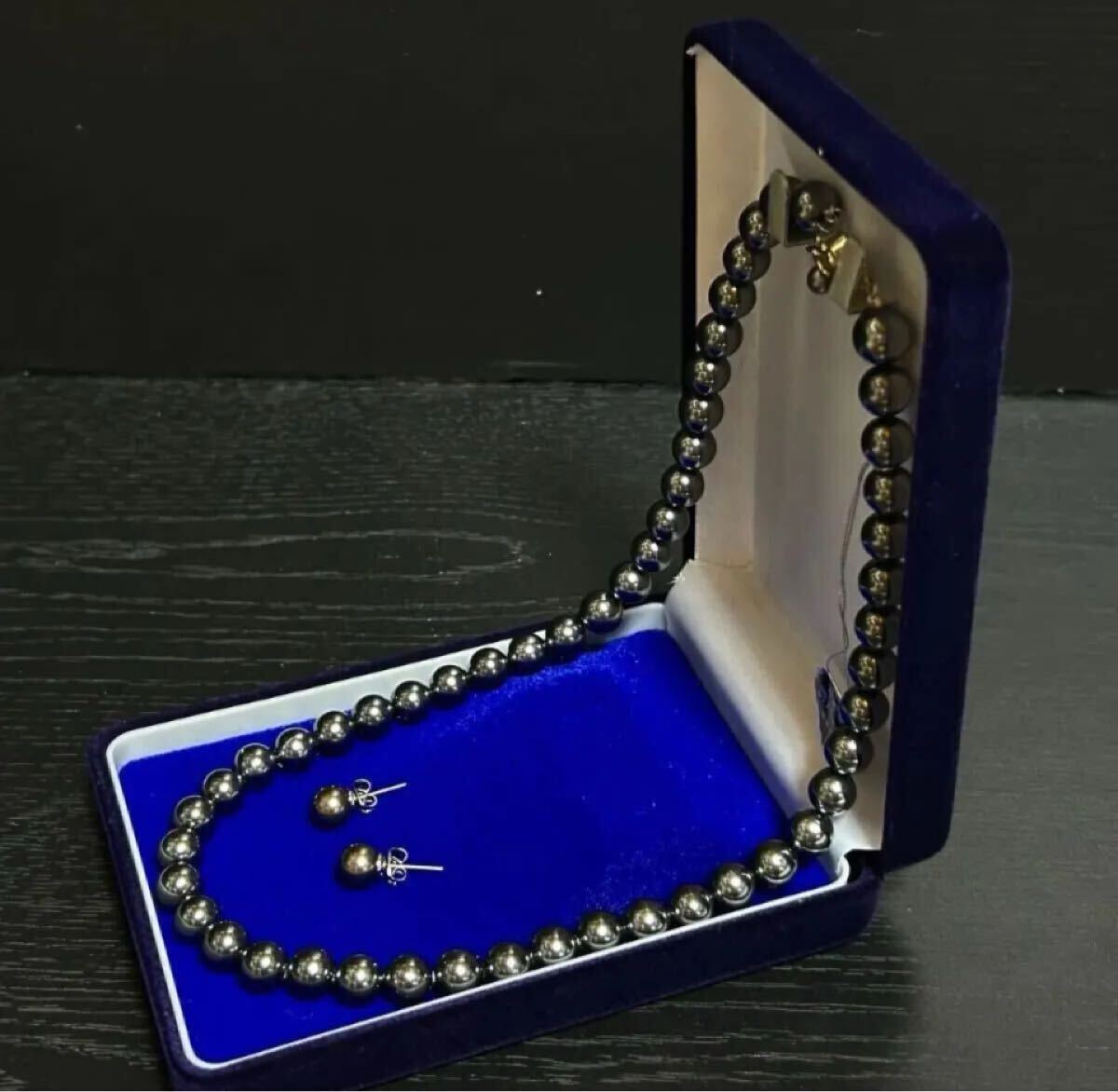 Product name: 最高級本貝パール ネックレス約9mm玉 全長約47cm/ピアス8mm玉/カラー:グレー/ケース付き ケースのカラー:紺色