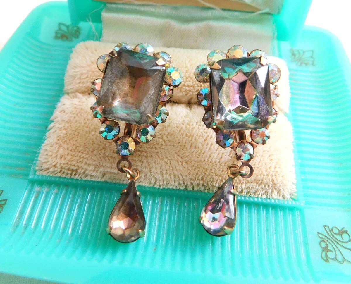 ヴィンテージイヤリング グレーオーロラガラスラインストーン揺れるデザインの古い美しいイヤリング ビンテージイヤリング