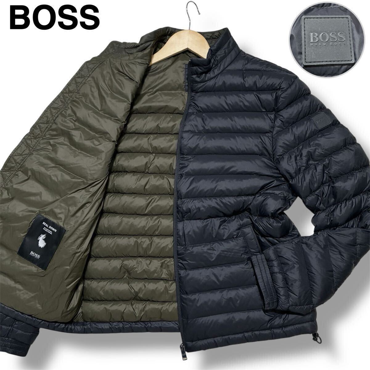 [極美品/近年/Lサイズ]HUGO BOSS ダウンジャケット ヒューゴボス 袖ラバー ロゴワッペン ブルゾン アウター ネイビー 濃紺 メンズ 極暖