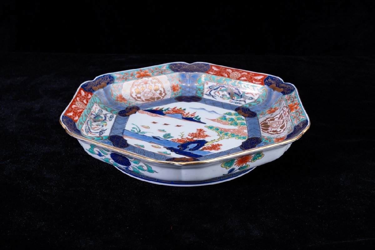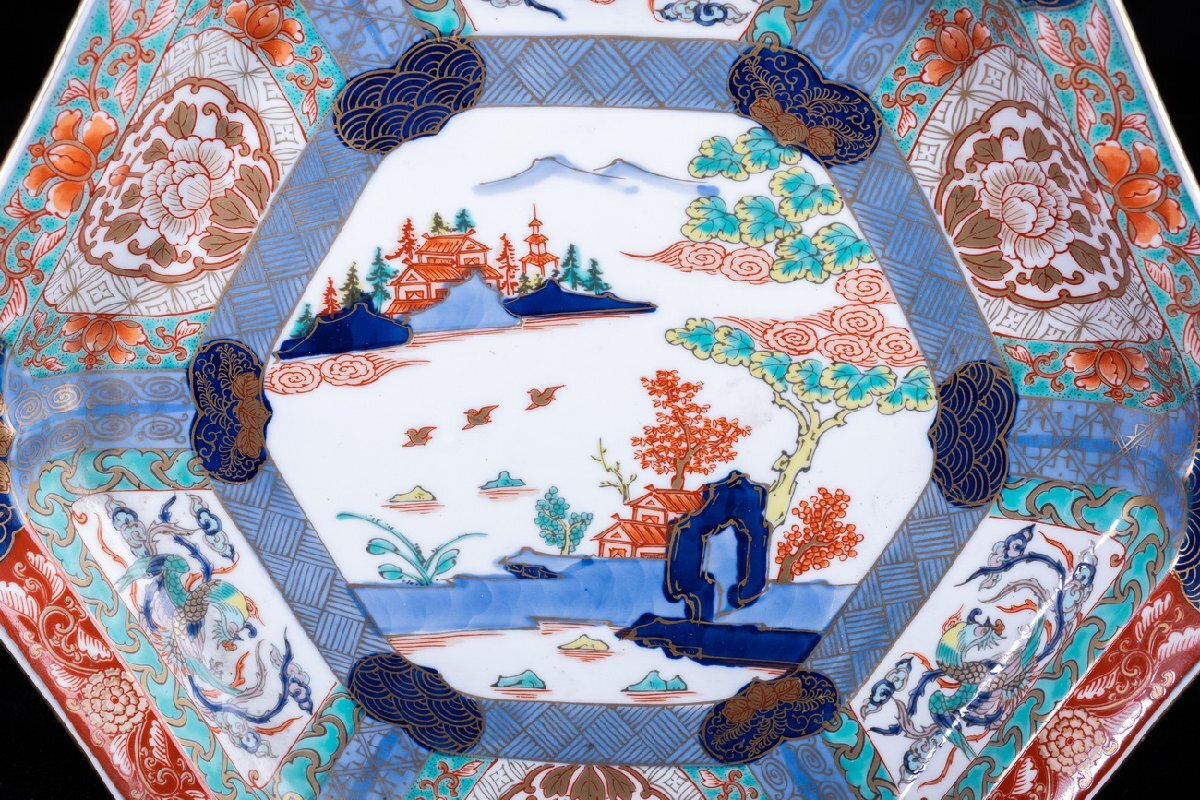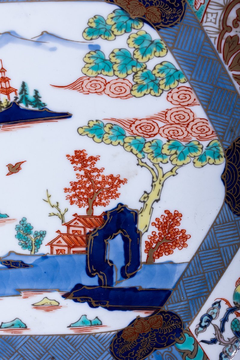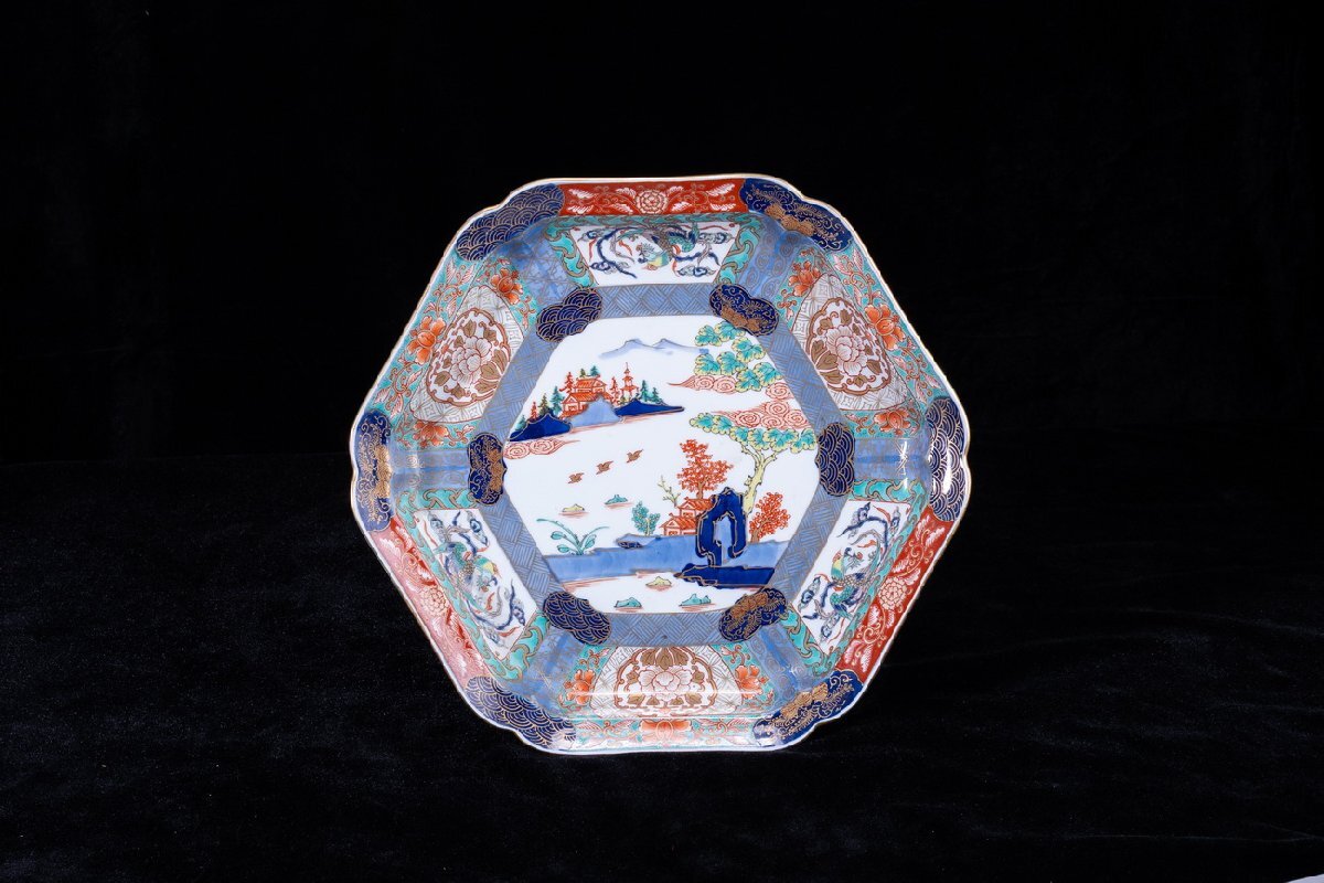 Product name: 【珍品堂】1円から M58-P8 有田焼 幸楽窯 古伊万里 在銘 染錦 錦色絵山水 六角皿 大皿 径31cm 和食器 懐石 骨董品 古美術