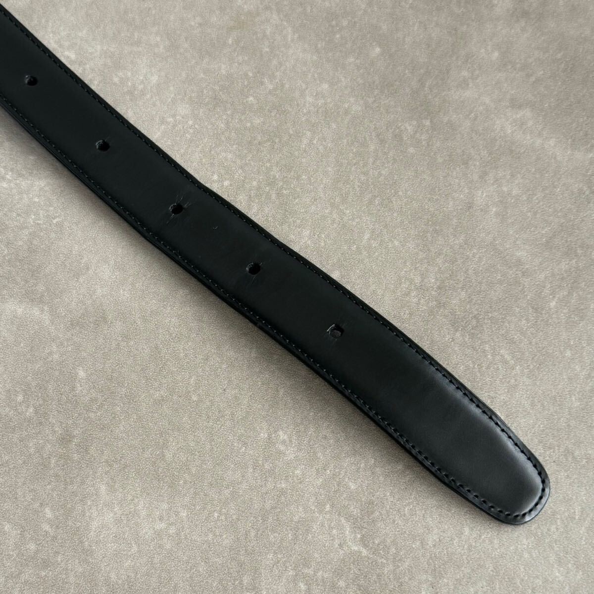 片面は艶やかなブラックスムースレザー、もう片面は上品なブラウンのサフィアーノレザー仕上げ。シーンに応じて印象を切り替えられる2WAY仕様となっており、ビジネスにもフォーマルにも対応します。バックルは鏡面仕上げのシルバーメタルにブランドロゴがさりげなく刻印され、控えめながらも確かな存在感を放つ仕上がり。