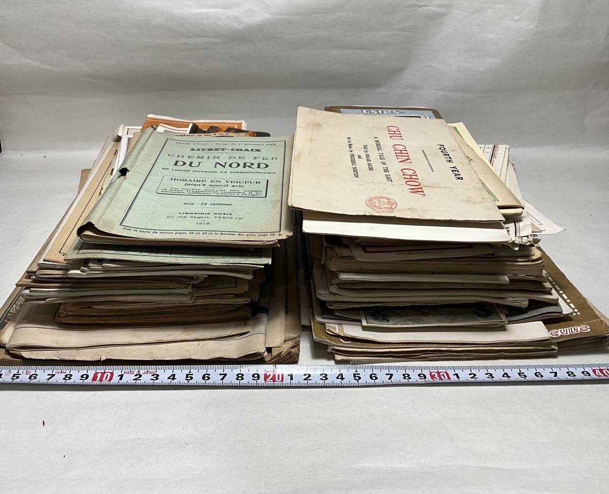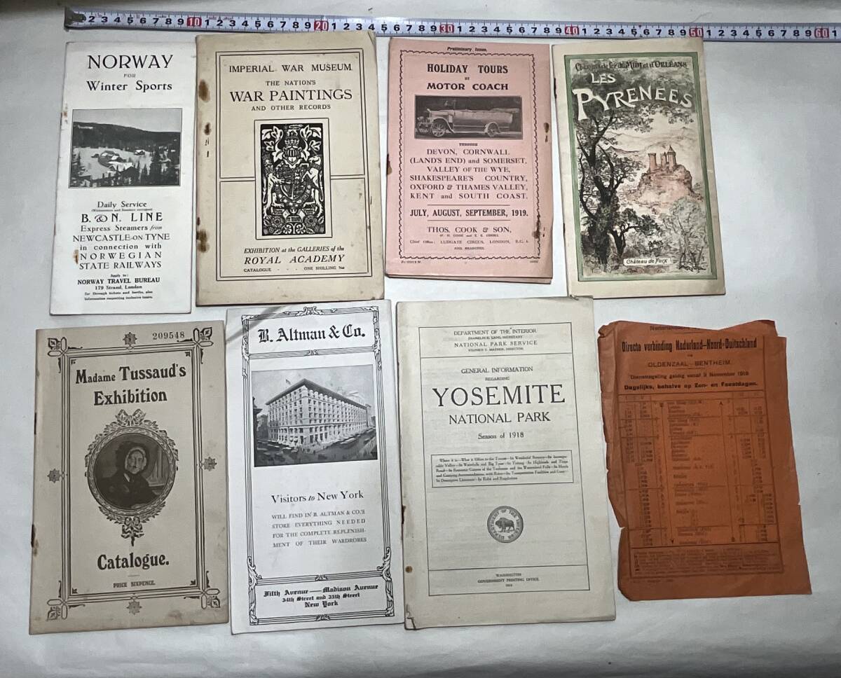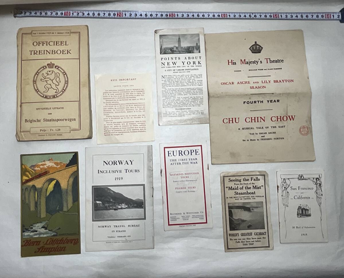 大きさは画像を参考にして下さい。1920年前後に外国に行った方のモノです。アメリカやヨーロッパなど鉄道の時刻表や地図、劇場のチラシ、ホテルの広告、雑誌などです。当時の資料はもちろん、デザイン素材などにも向いています。