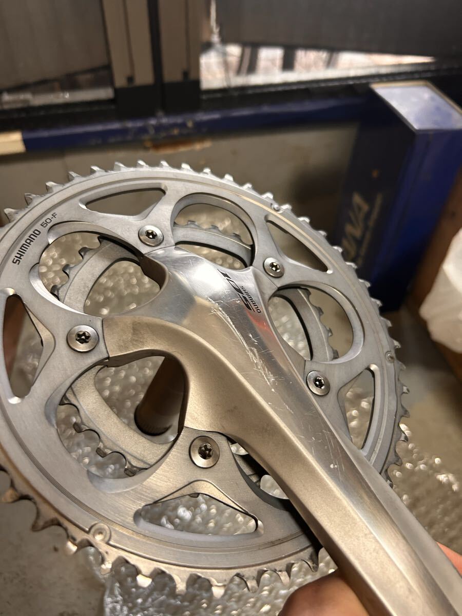 最近話題のショートクランクです。摩耗については歯のアップ写真で確認してください。34Tと50Tです。左クランクのボルト、キャップ、クリップも付属します。