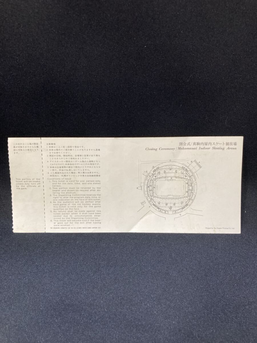 1972年札幌オリンピックの閉会式の日のチケットです。一等席のものは少し珍しいかと思います。2枚セットでございます。