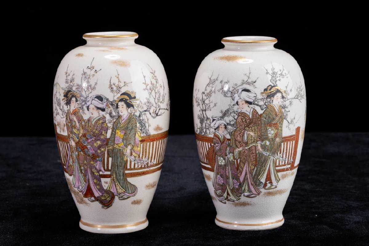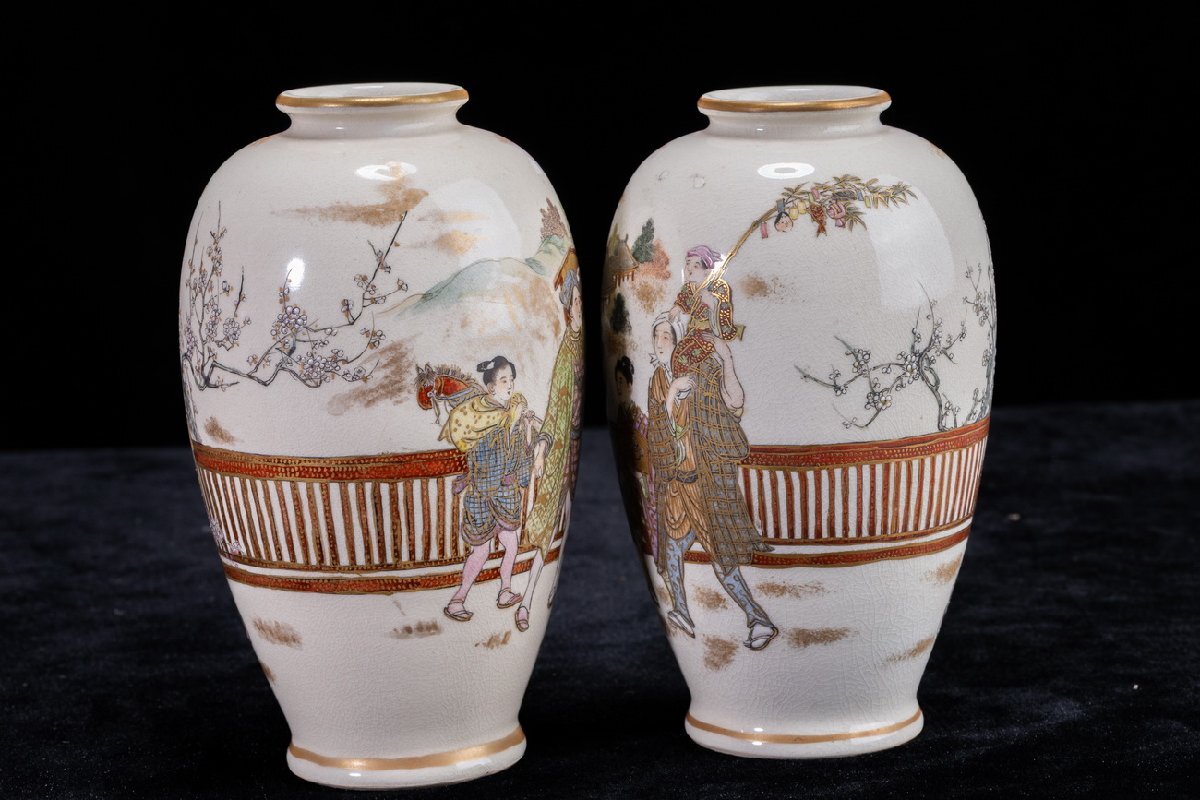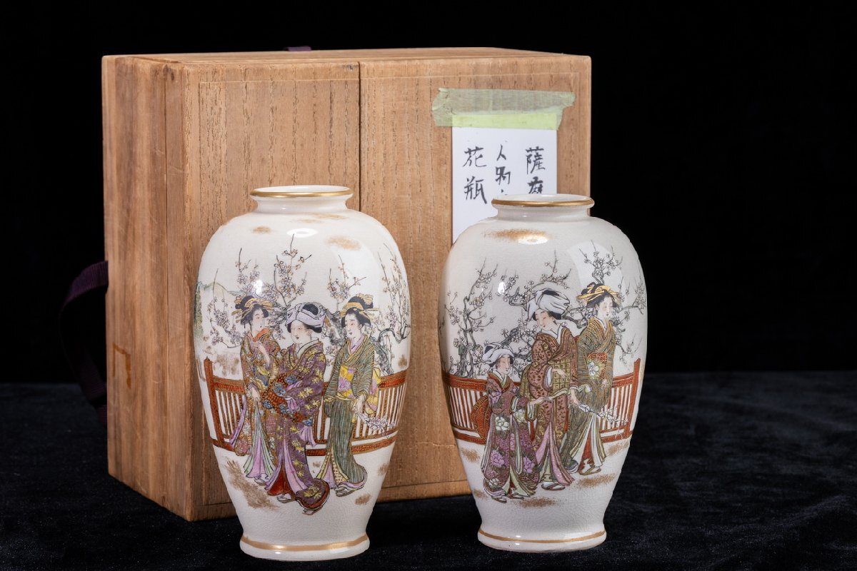 Product name: 【珍品堂】1円からP54-V08 薩摩焼 椿山窯 紫紅 金彩色絵 繊細描き 在銘 人物文様 華瓶 2体 高16cm 共箱 木箱 花瓶 花生 花入 骨董品 古美術
