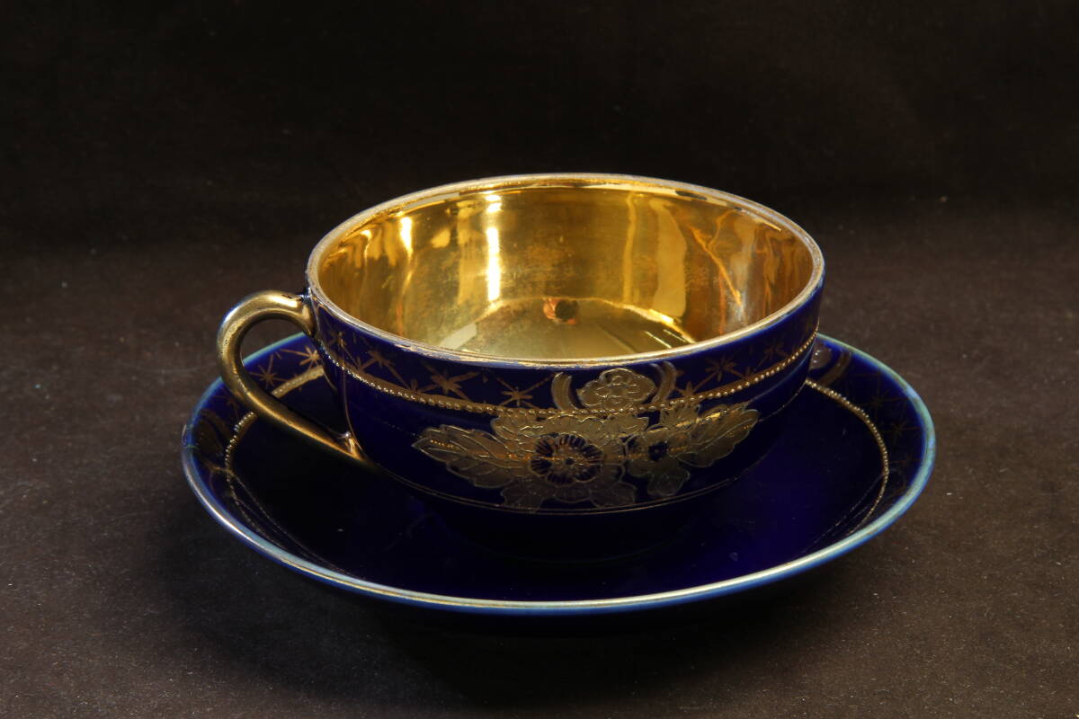 ロイヤルブルーの下地に金彩で全体を飾った カップ&ソーサ