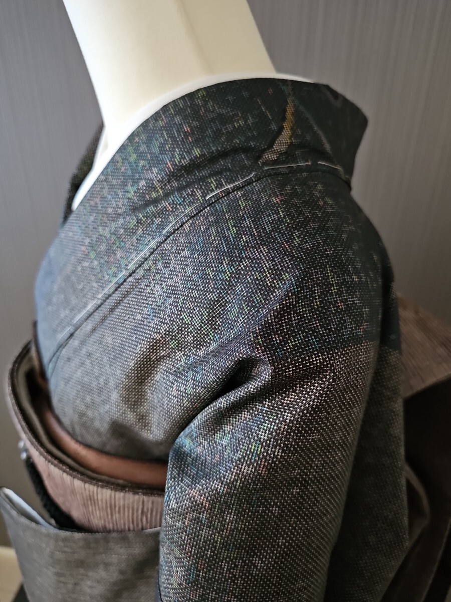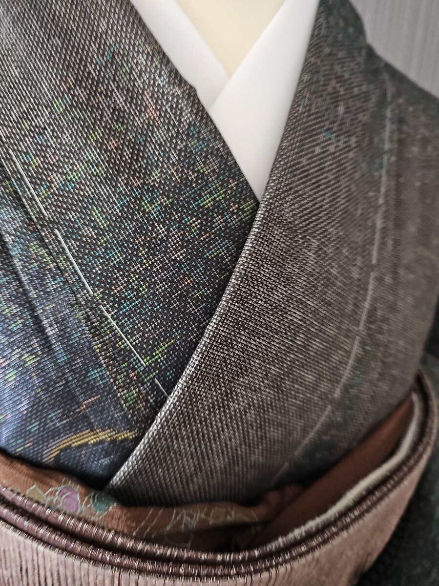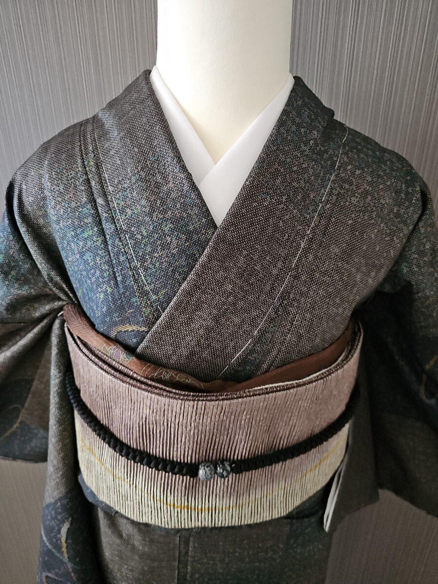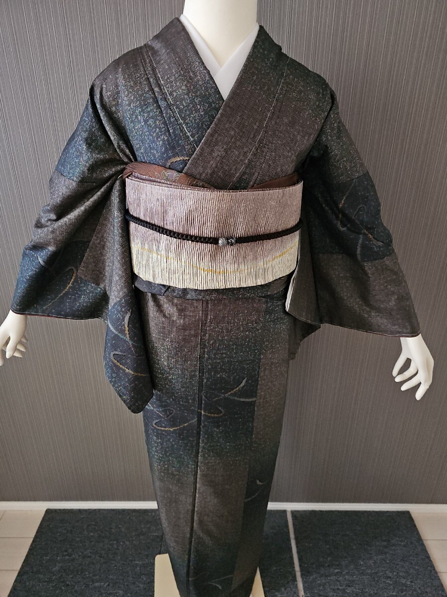 ★滑かな光沢美しい織地、泥染大島紬らしい茶×黒緑系のダークな色調に絣織の込み入った文様が艶やかさを表現する上等なお召し物でございます。