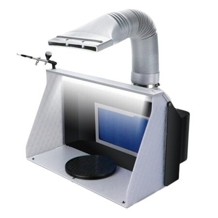 上向き排気ダクトにより設置面積が作業スペースとほぼピッタリで、設置場所の奥行を有効活用できます / 付属の回転プレートを使えば、パーツを360°回転させながら塗装やチェックを行うことが可能です / ハンドピーストレイが付属しており、塗装作業を一時中断するときにエアブラシを簡単に収納できて、大変便利です / 使用しない時には折り畳んでスッキリとコンパクトに収納可能なので、収納場所に困りません / 取っ手も付いているので、どこへでもお気軽に持ち運びができます