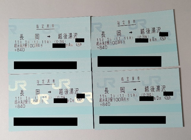 越後湯沢駅100周年号 11/1(土) 上り(往路) 長岡→越後湯沢 ボックス席(ABCD席連番)普通車指定席4枚