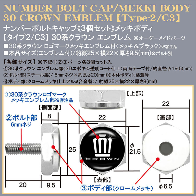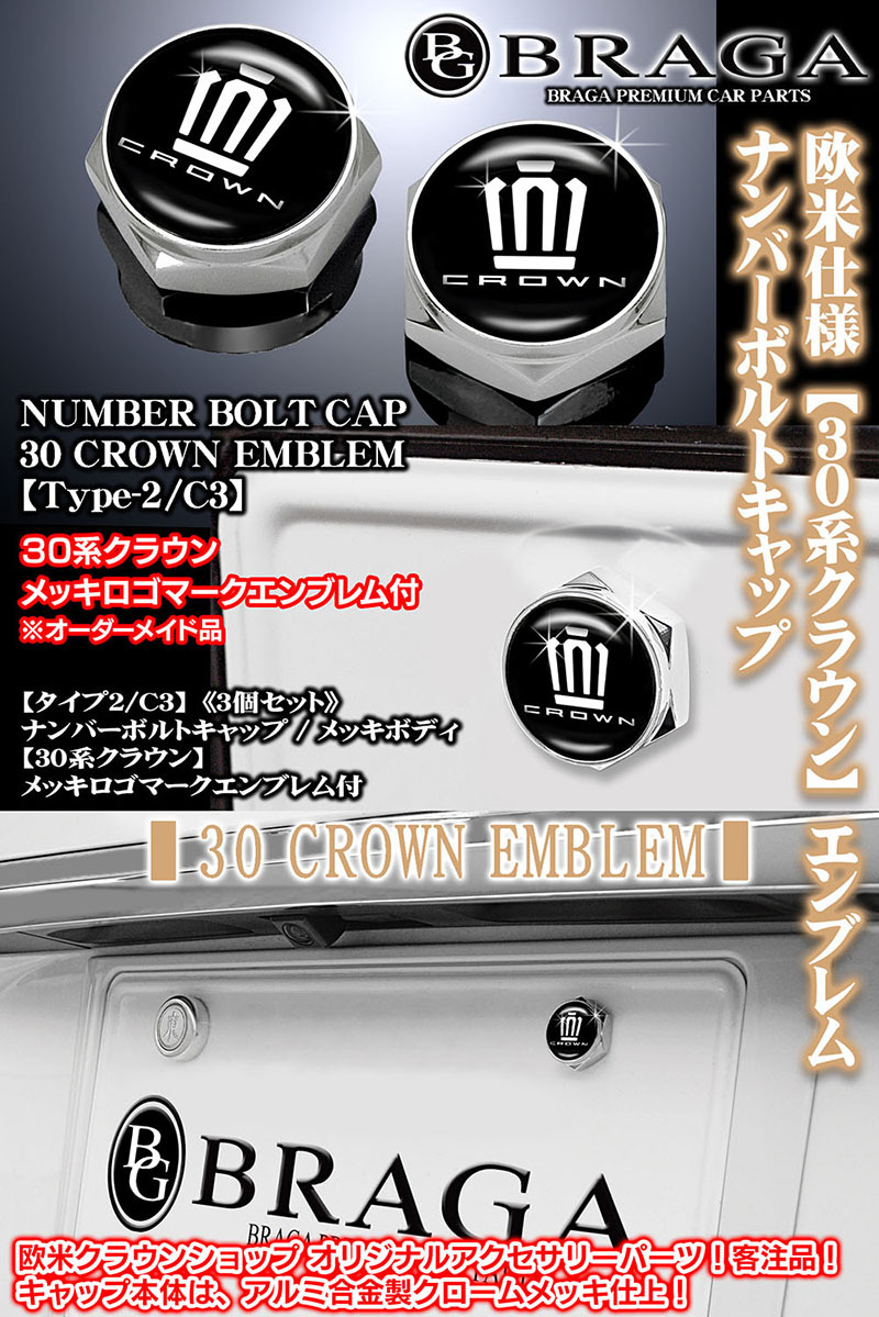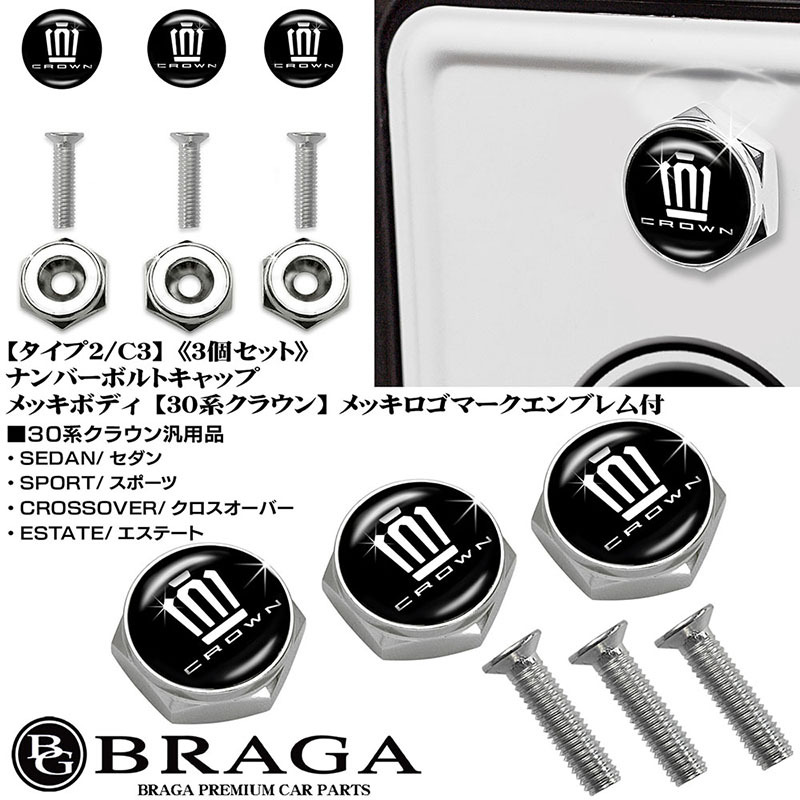 30系クラウン/王冠ロゴマークエンブレム付/客注品/メッキボディ/ナンバーボルトキャップ/タイプ2 C3/3個入/互換品/欧米仕様 BG BRAGA