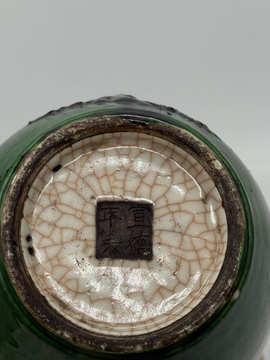 中国明代宣徳年間の名を冠した「宣徳年製」銘をもつ緑釉花瓶。