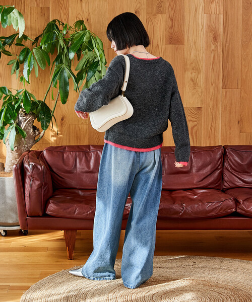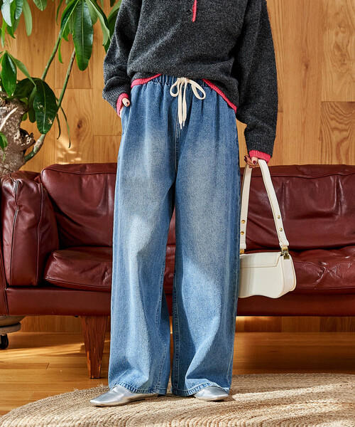 キーワード:ジーンズ デニム デニムパンツ レディース ウエストゴム ストレート ハイウエスト フルレングス リジッドデニム ワイドパンツ 無地