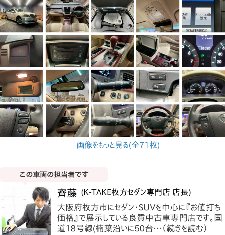 K-TAKE枚方店は国産セダン・SUV・ステーションワゴンを中心に取り扱いしております。趣向性の高い車種になりますので、専門知識を持ったスタッフにてご案内させて頂きます。コーティングやカスタム等はもちろん、任意保険、オートローンまで安心のカーライフをお約束致します。整備、保証などのアフターサービスも当店ですべて行えますのでご安心ください。当社は全国のオークション会場、約160カ所と業務提携を結んでおります。全国60000台以上の中古車を当店でご商談、ご契約、ご納車可能です!
