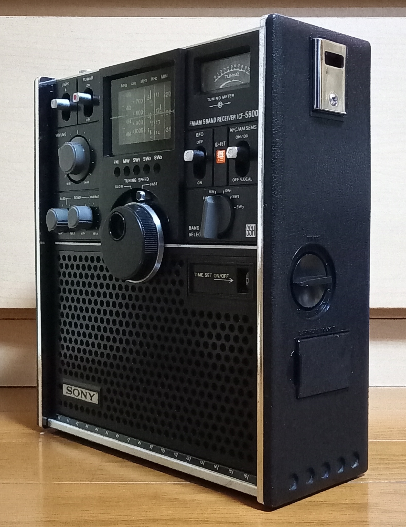 スカイセンサー『ICF-5800』の修理整備済み動作品で、 各バンドとも良好に受信でき、BFOも動作し、SSB、CWの復調もできます。   バンド切り替えスイッチ他のスライドスイッチは、分解清掃し、接点グリスを塗布してありますので、 長期間接触不良は出ないと思います。音量及びトーンコントロールに気になるようなガリはありません。 不良になりがちなAMのトランジスタ(2SC710)は代替トランジスタに交換してあります。