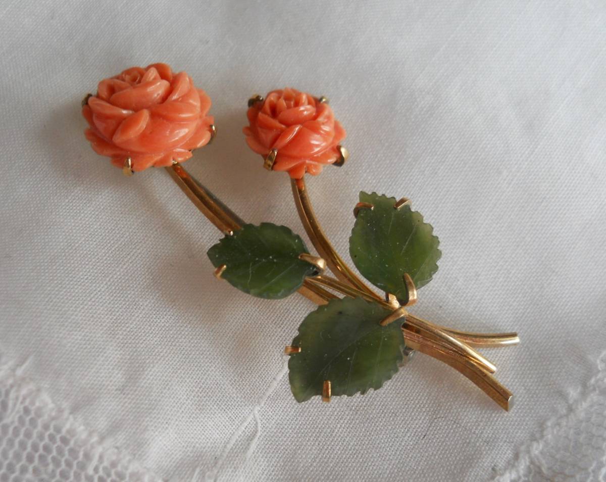 アメリカ製ヴィンテージ Krementz 珊瑚と翡翠 薔薇のブローチ