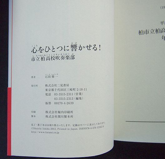 Product name: 単行本「心をひとつに響かせる!」市立柏高校吹奏楽部 石田修一著 吹奏楽部強豪校の指導者は生徒に何をどう伝えてきたか 二見書房 2013年