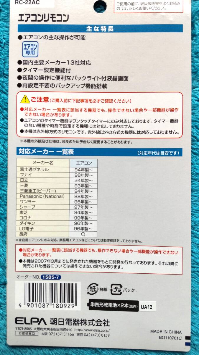 ELPA  エアコンリモコン(13社対応)  乾電池なし  1個  ※赤外線確認し、日立のエアコンで使用しておりました。