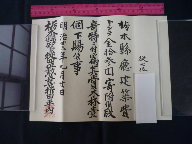 明治23年9月20日 木杯壹個下賜候事 栃木県廳建築費寄付金拾参円 従七位  栃木県知事従四位勲三等 折田平内 印刷です