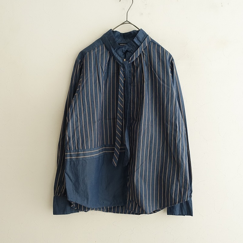 2024年コレクションpas de calaisのコンパクトコットンストライプブラウスです。カラーはネイビー×ブルーのミックス・ダークブラウン・ホワイトで、ストライプ織地で仕立てられております。フロントボタンは襟元以外は比翼仕立てで、リボンタイが付属されております。定価(メーカー希望小売価格)36,300円 税込みの商品です。