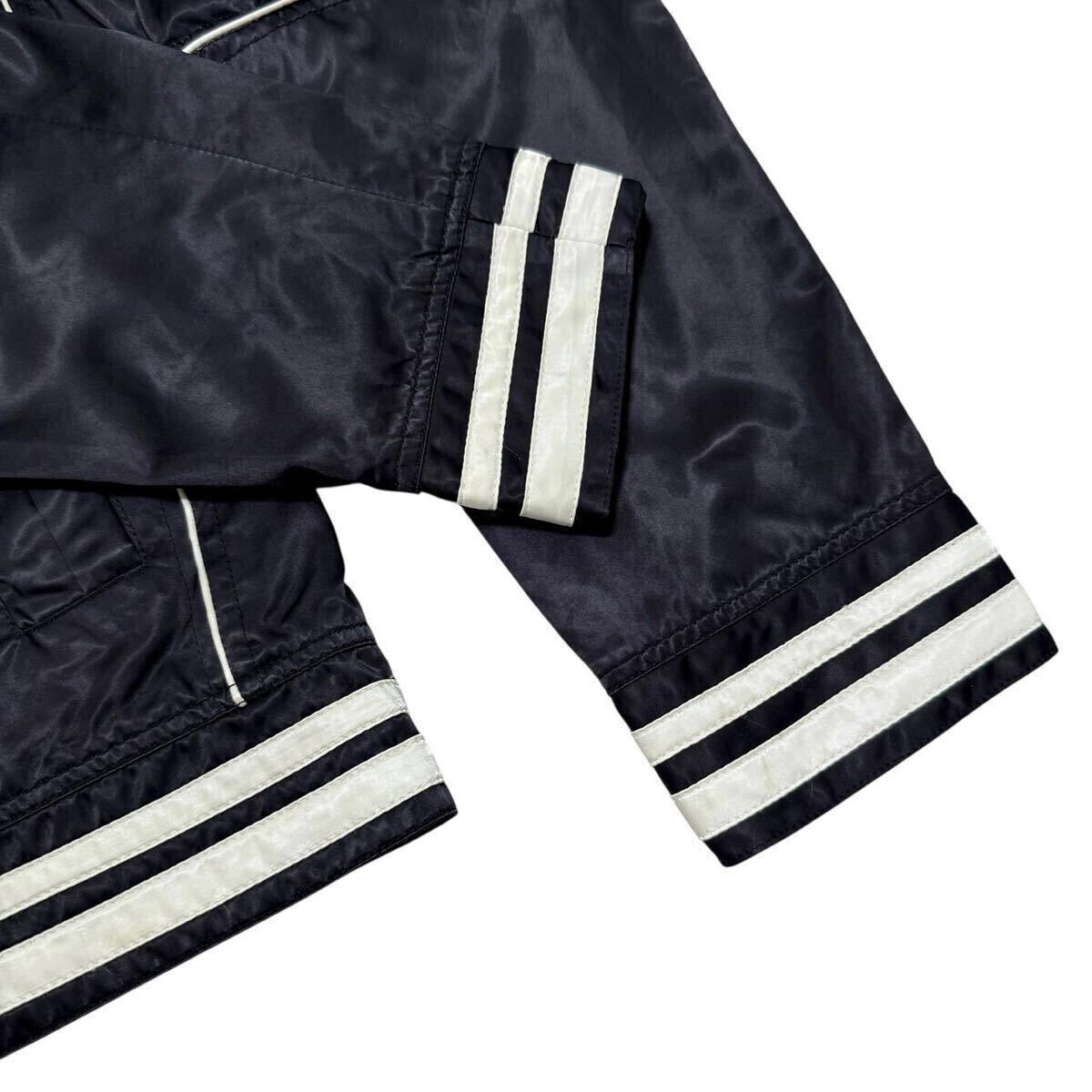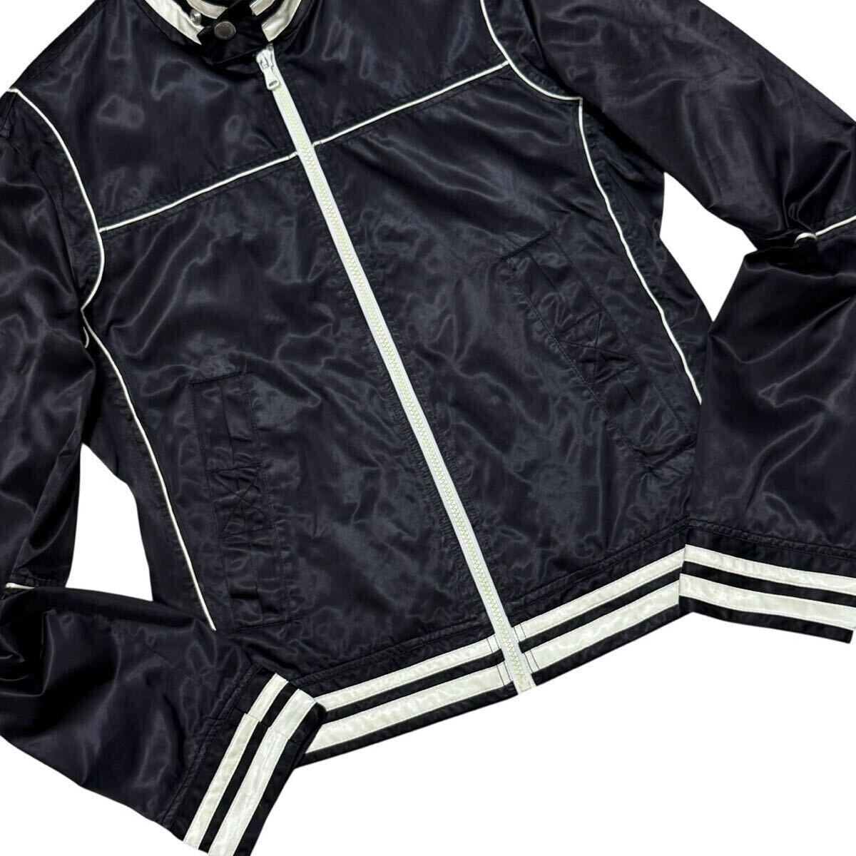光沢感のあるブラックのサテン生地をベースに、ホワイトのパイピングやラインがアクセントとして映えるスポーティなブルゾン。軽量かつ柔らかなナイロン素材(ポリアミド)で仕立てられており、内側はメッシュ仕様となっているため通気性も良く、春先から初夏にかけて快適に羽織れるアイテムです。