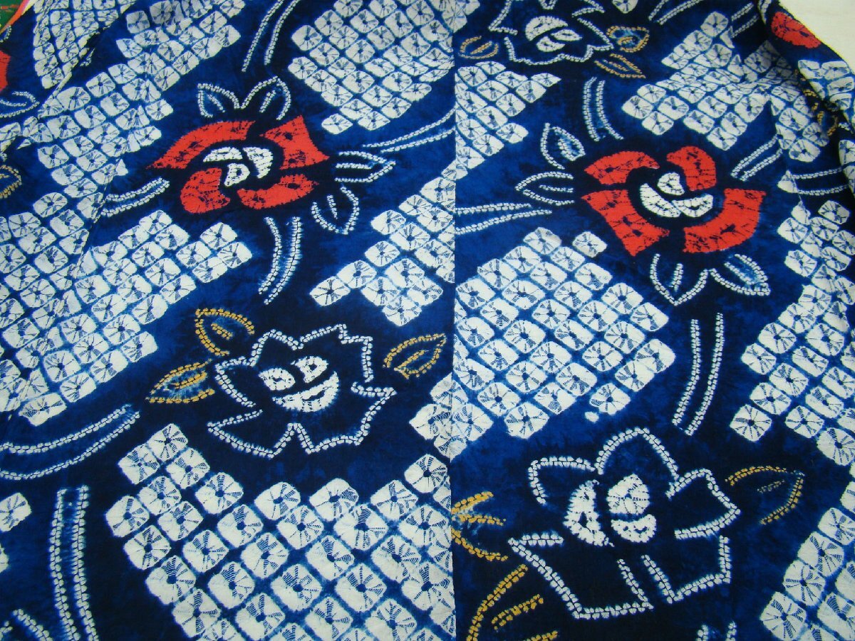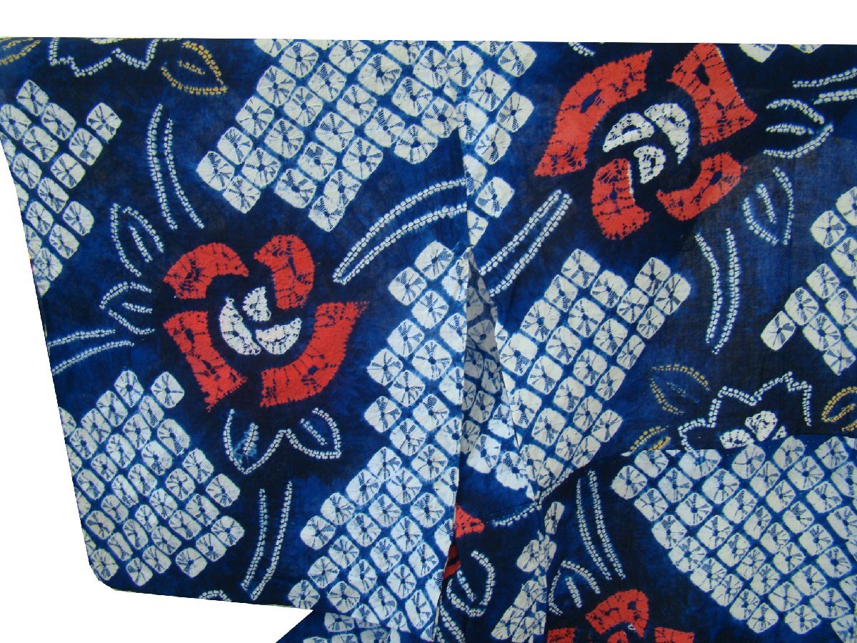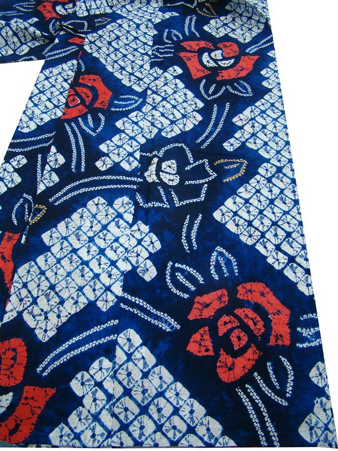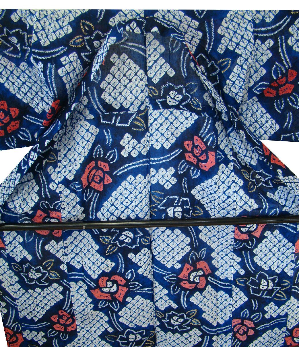 濃紺地に灰白、紅色の花柄。 広衿。  手縫い仕立。