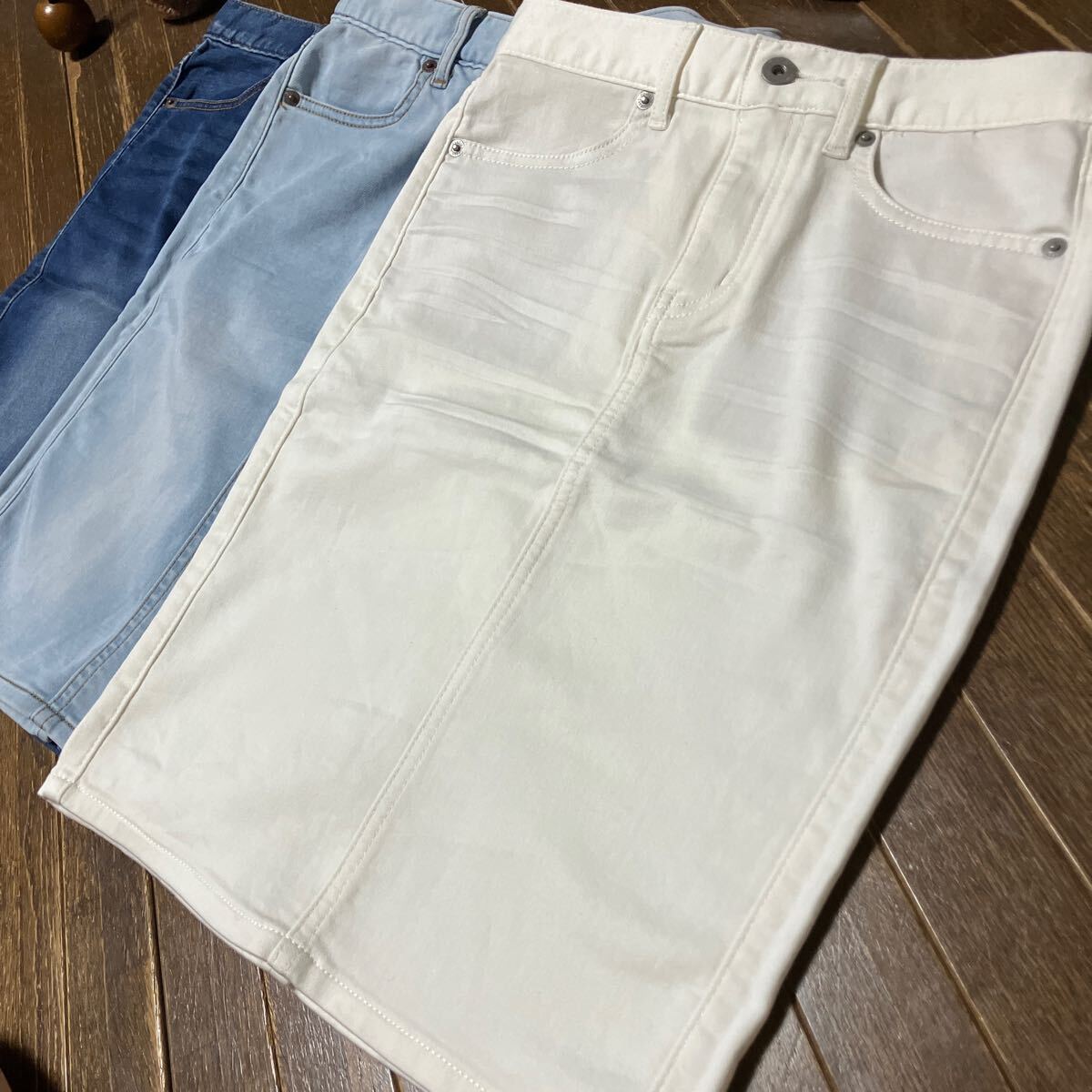 美品GUストレッチデニムミニスカートタイトスカート細身白ウォッシュインディゴ三点セットXS薄手 ジーンズ ブルー