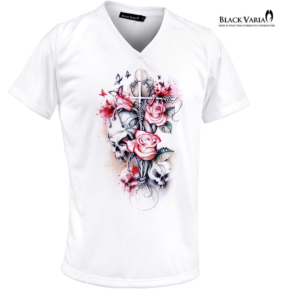 Product name: 35363-s04 Tシャツ スカル ドクロ 髑髏 Vネック スリム 半袖Tシャツ プリント ユニセックス(ホワイト白スカル薔薇十字架) M 送料370円~