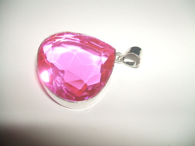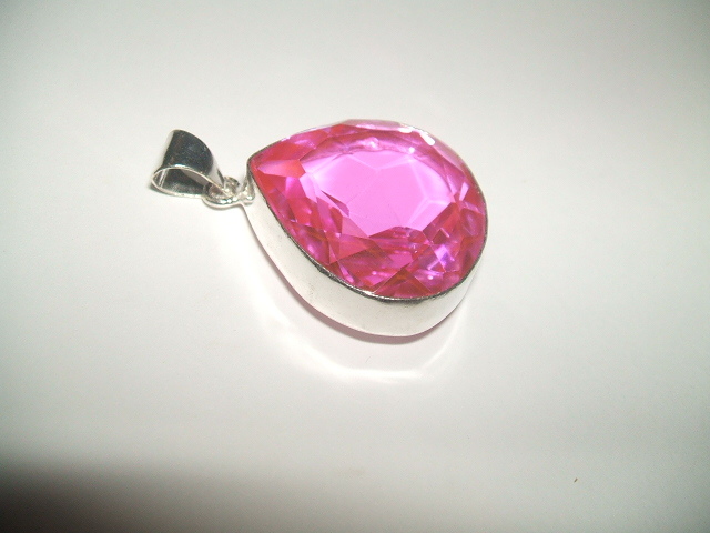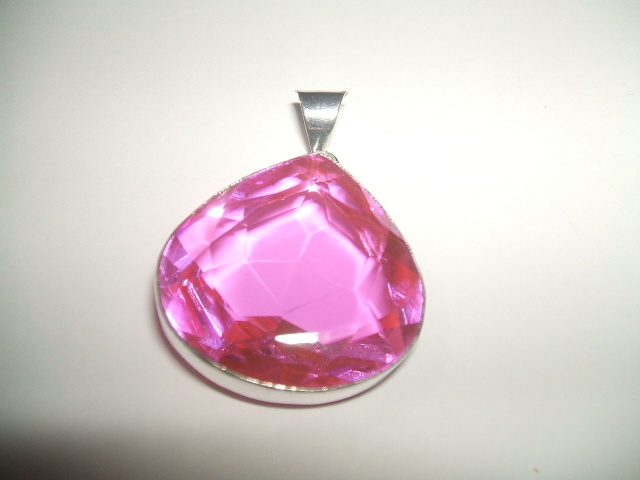 キラキラした輝きが美しいピンクカラートパーズトップです。石の大きさは約2.7x2.7センチ。金属はシルバーで925の刻印があります。写真では暗めに写っているものと明るく写っている2種類を並べていますが、実際の色はその中間ぐらいになります。写真と実際の色や雰囲気は全く同じではありませんので、あらかじめご了承ください。