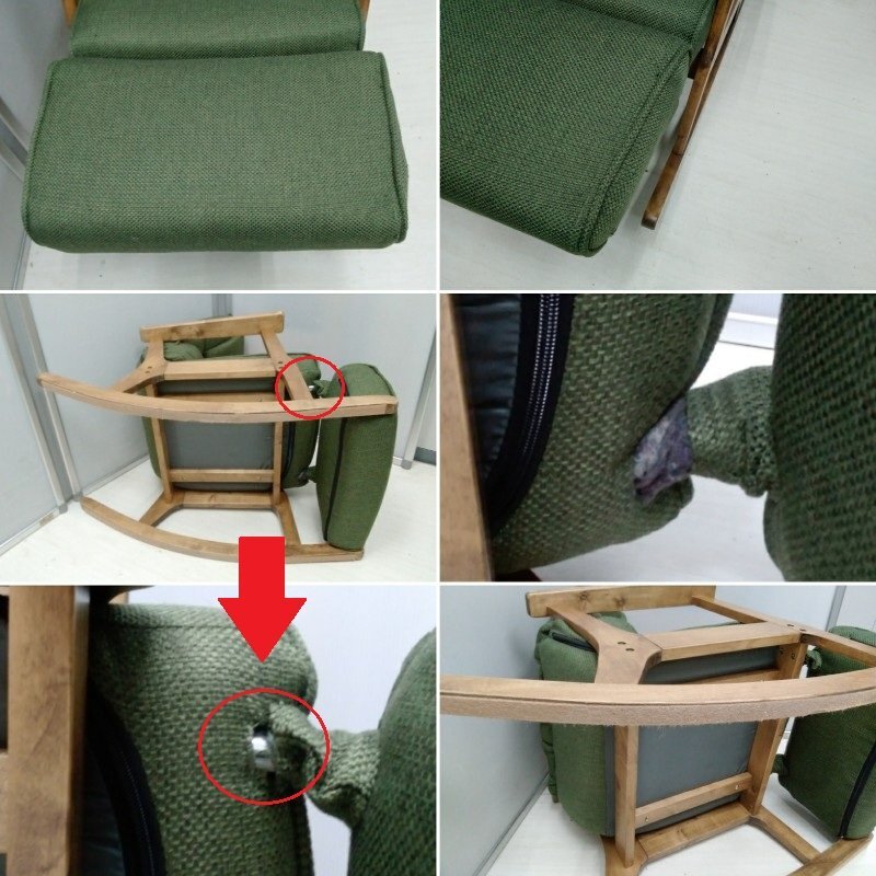 状態は使用品となり、擦り傷・小傷・汚れ・生地にホツレなどがあり、 足載せの角度調整金具部分(赤丸参照)の中のクッション材が片方ありません。