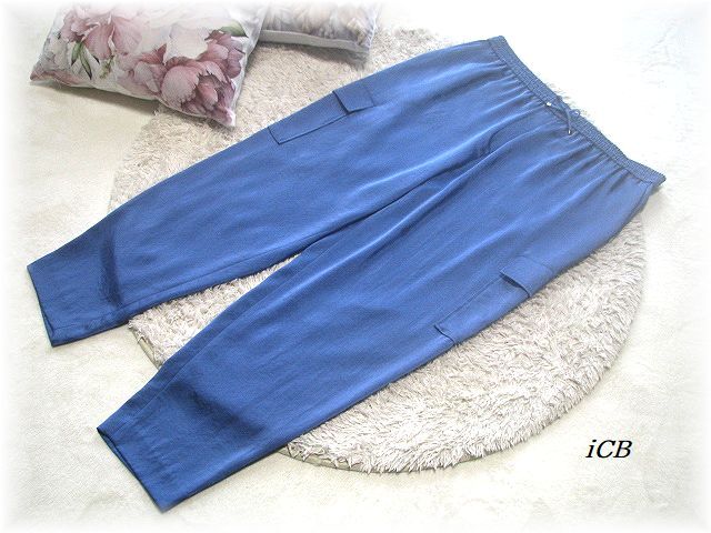 送料無料*iCB*大きいサイズ48(19号)*光沢サテン素材イージーカーゴパンツ/ウエストドロストゴム仕様/ウォッシャブル/ブルー