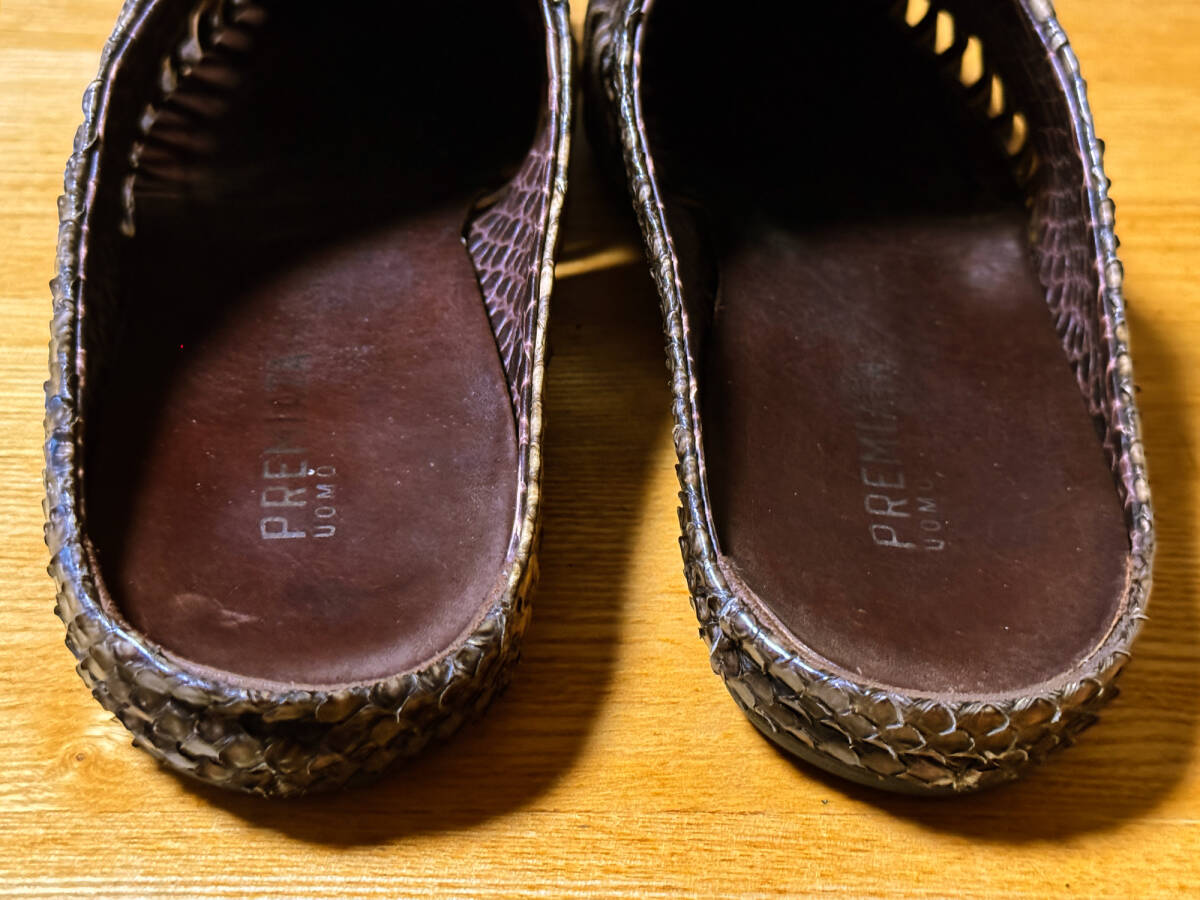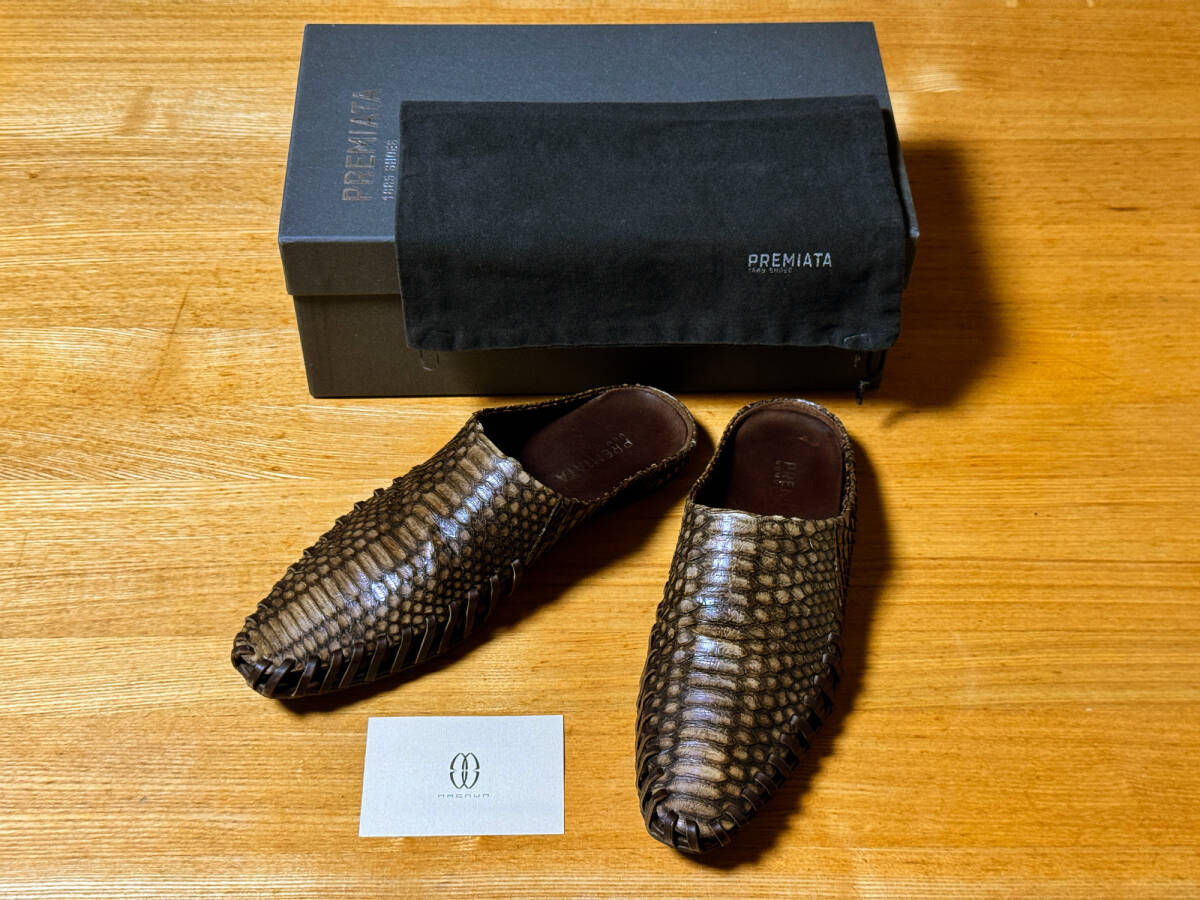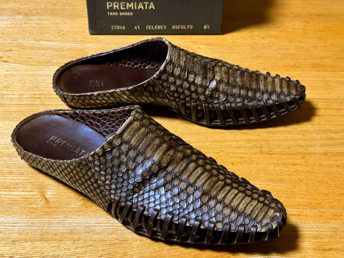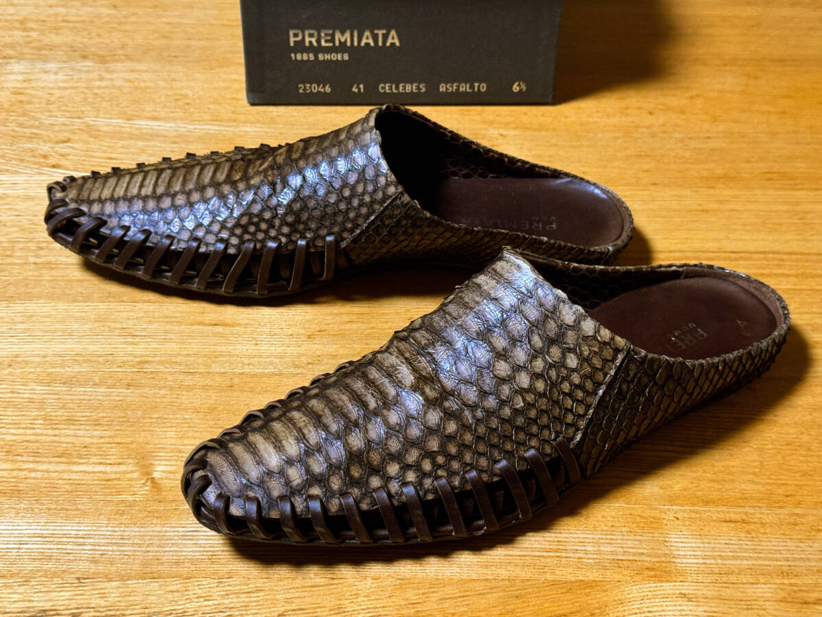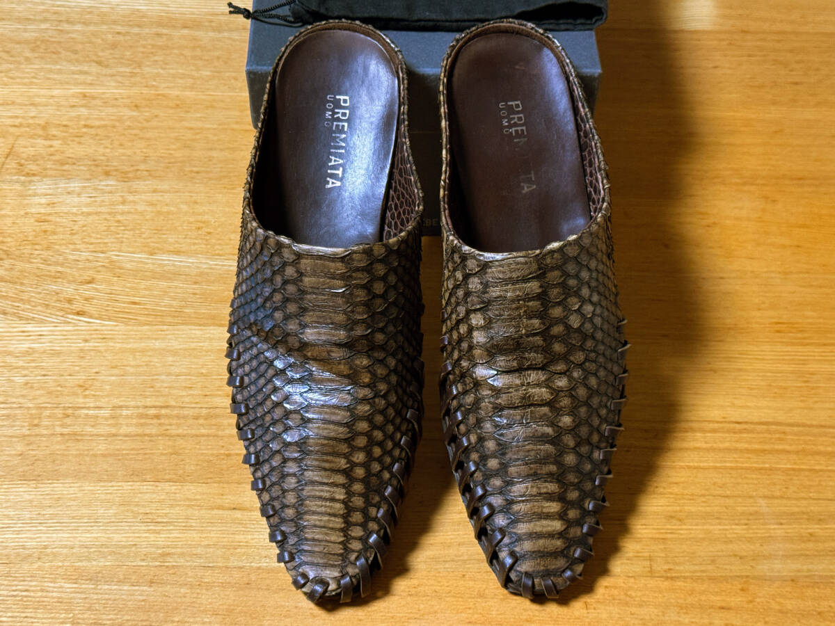 スネークスキンと牛革を組み合わせたマグナム取扱期のプレミアータらしいエキゾチックで凝ったデザインのミュールサンダルです。