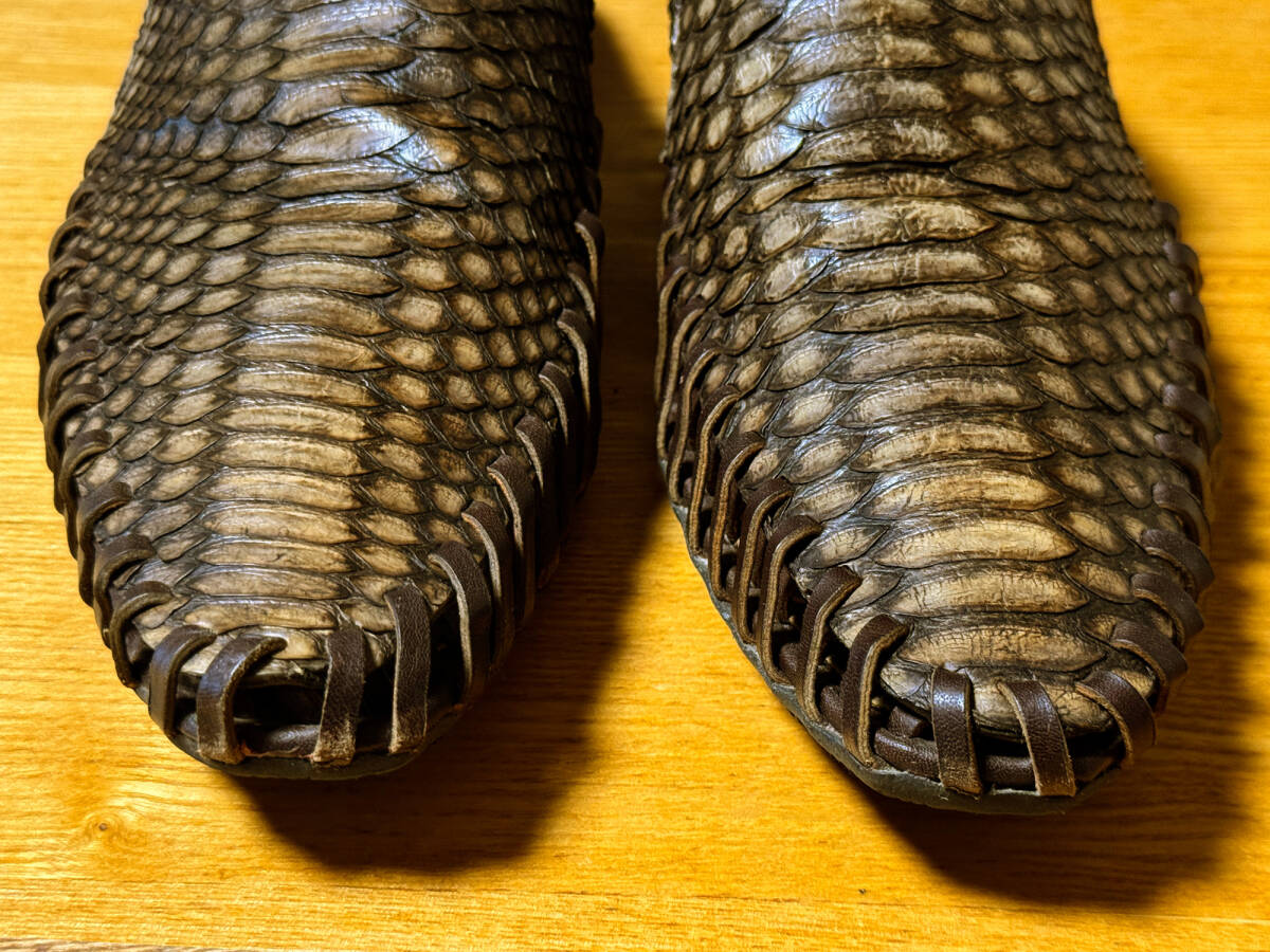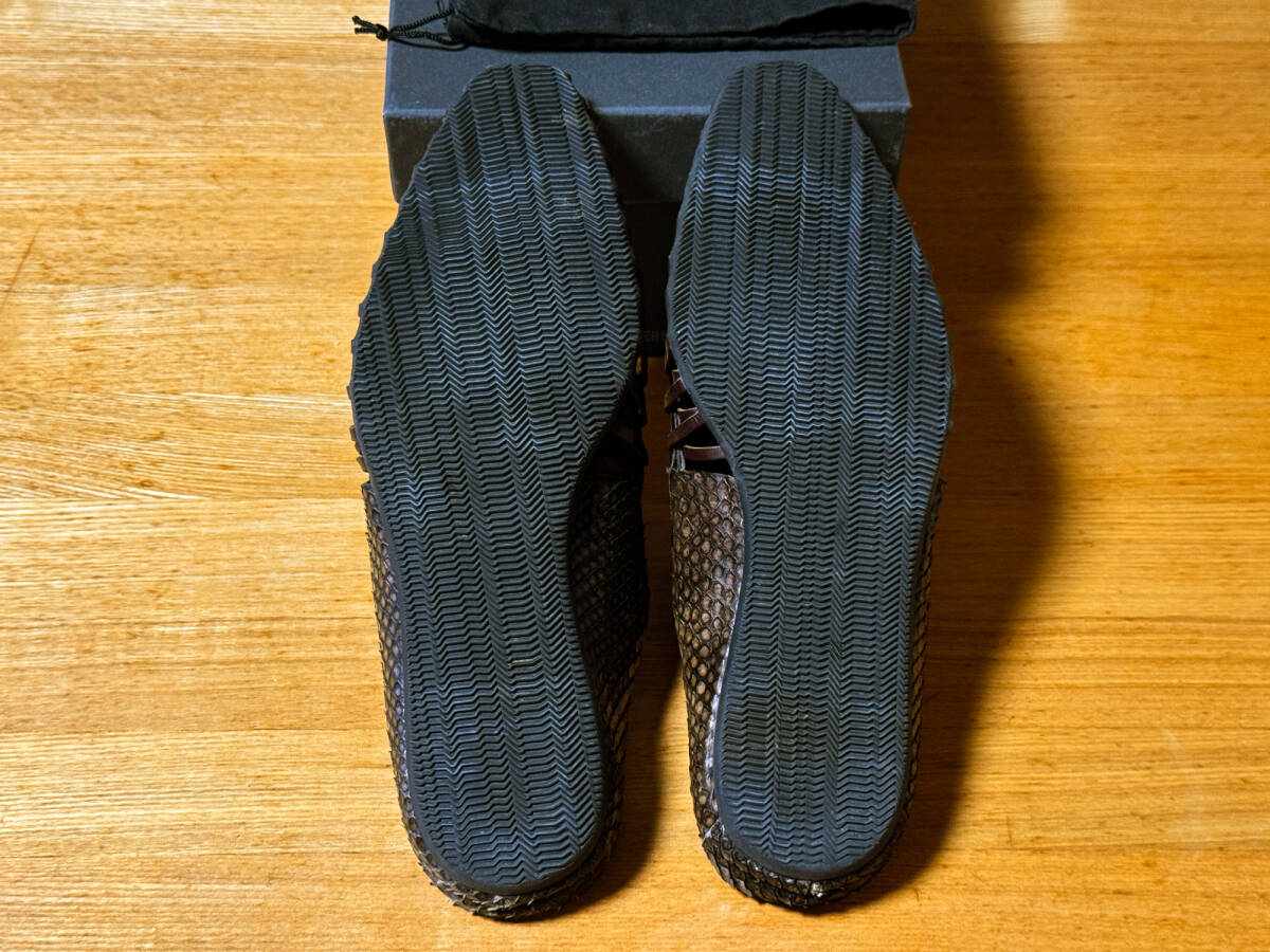 装着後はモウブレイ製ステインリムバーでインソールを拭き取りモウブレイ製デリケートクリームを塗布して拭き取り&ブラシング、アッパーのスネークスキン部分はサフィール製レプタイルクリームを塗布して拭き取り&ブラシングのみ、アウトソールはステインリムバーで拭き取り&ブラッシングのみのお手入れのみで、調湿機能付きのウォーキングクロゼットに保管しておりました。ソールの摩耗もわずかでインソールのロゴ印字が擦れている程度で状態は外見は美品です。