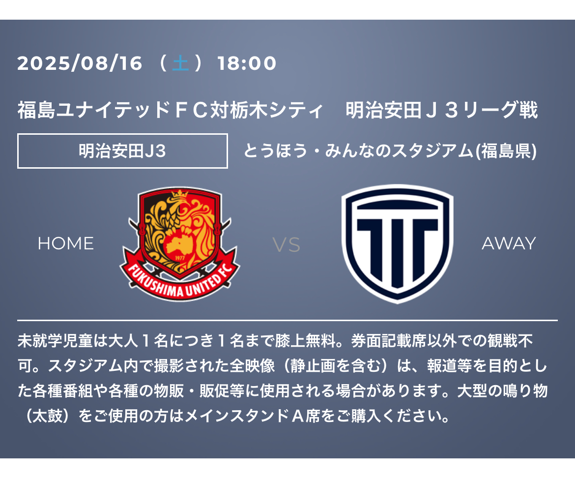 Product name: 2025/8/16 18:00 福島ユナイテッドFC対栃木シティ 戦 明治安田J3リーグ Jリーグ J1 J2 J3 とうほう・みんなのスタジアム