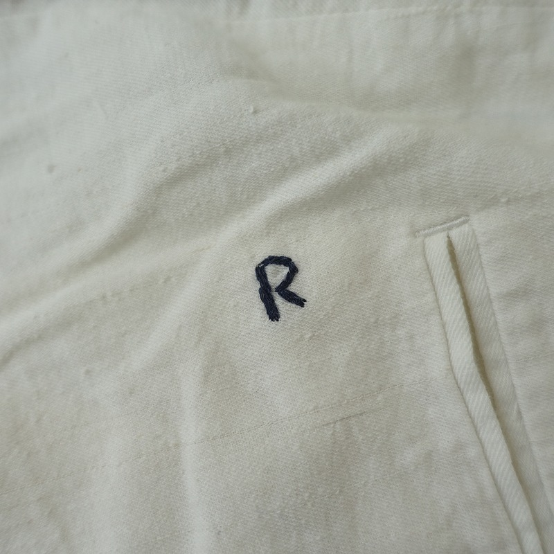 45Rのムラ糸コットンツイルタックテーパードパンツです。カラーはオフホワイトです。コットンのムライトで綾織りされたやや薄手の柔らかな生地を使用。透け感・糸節・ネップ・色糸・綿カス・シワなどが見受けられるナチュラルな素材です。左の2ボタン開きで、ウエストはゴム入り、ベルトループ付きです。フロントの腰帯の下に2タック入り。ヒップに玉縁ポケット、両サイドにシームポケットがございます。定価(メーカー希望小売価格)41,800円の商品です。