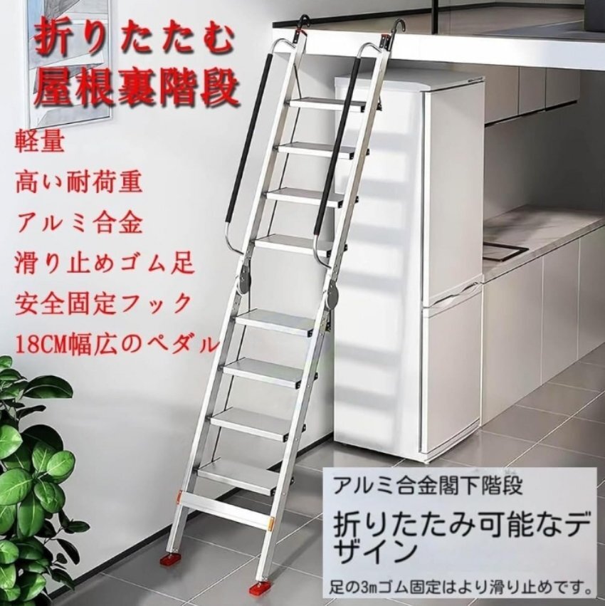 Product name: 屋根裏階段軽量アルミ合金折りたたむ伸縮はしご 脚立はしご 多機能ロフトはしご 屋内 滑り止めゴム足 ロフトラダー バルコニー 階段 壁掛屋