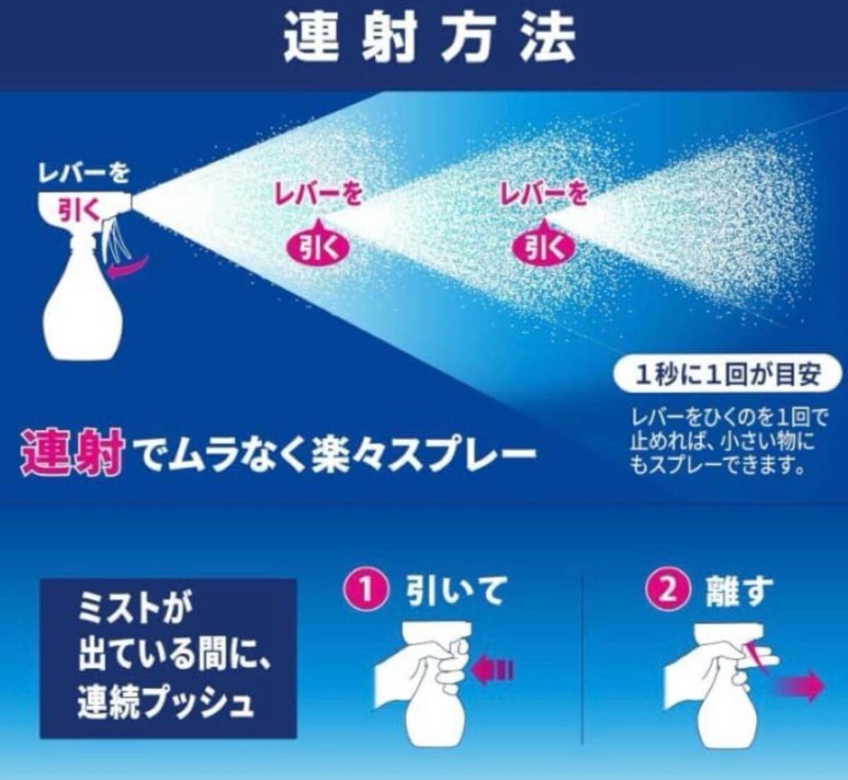 ワイドに広がるスプレーで大きいアイテムにも楽々スプレー可能。ベッドやカーペット、ソファへの使用がおすすめ。