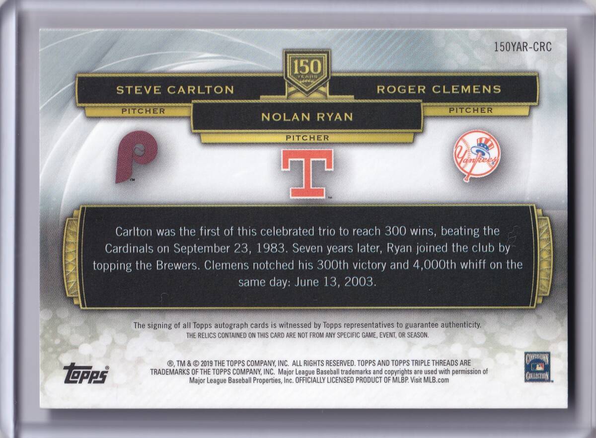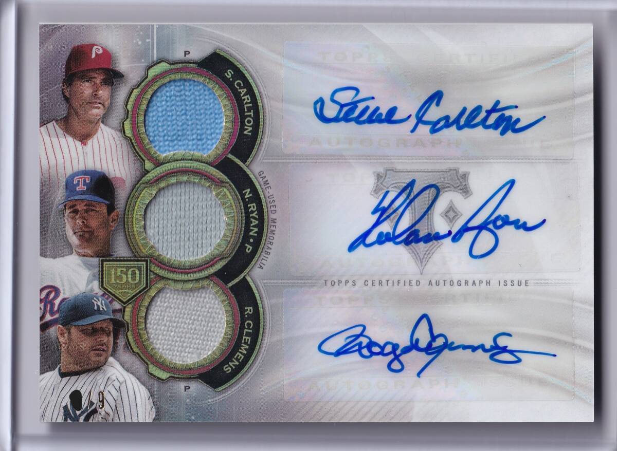【9枚限定】NOLAN RYAN & ROGER CLEMENS & STEVE CARLTON 直筆サインカード 2019 TOPPS TRIPLE THREADS TRIPLE RELIC AUTOGRAPH CARD