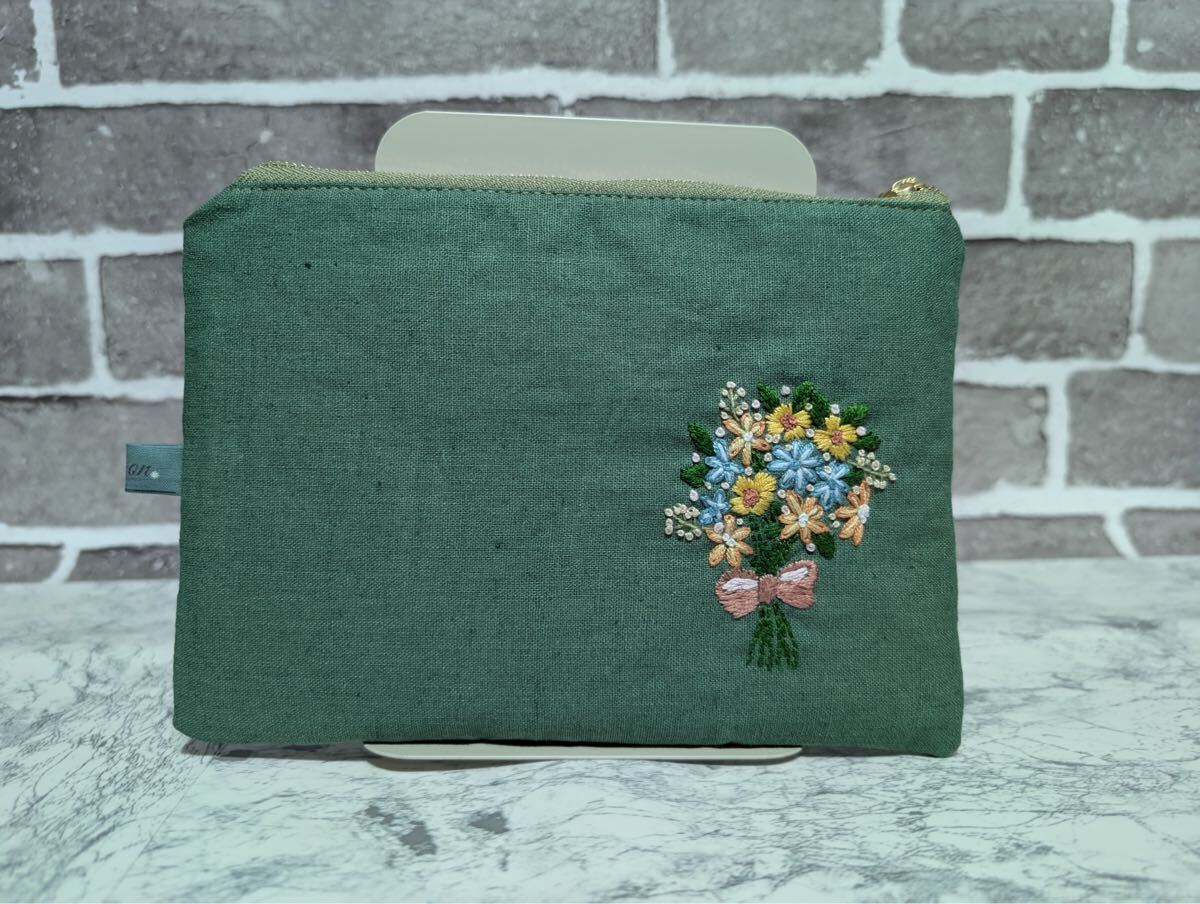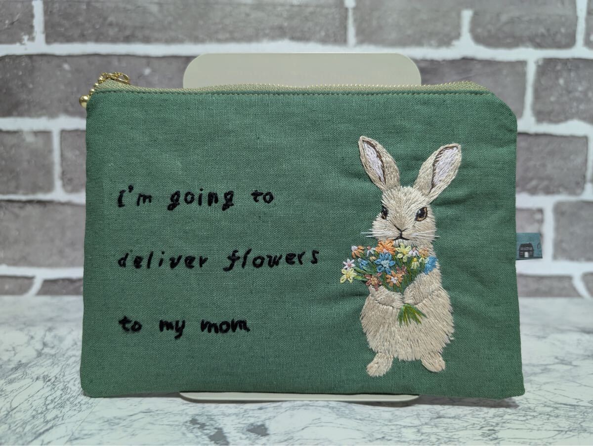 ハンドメイド 刺繍 ポーチ 手刺繍 うさぎ 花束