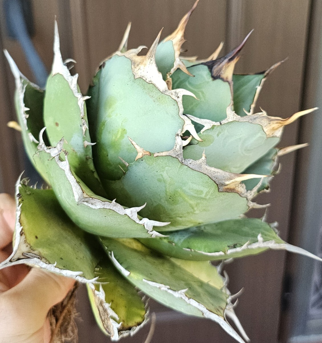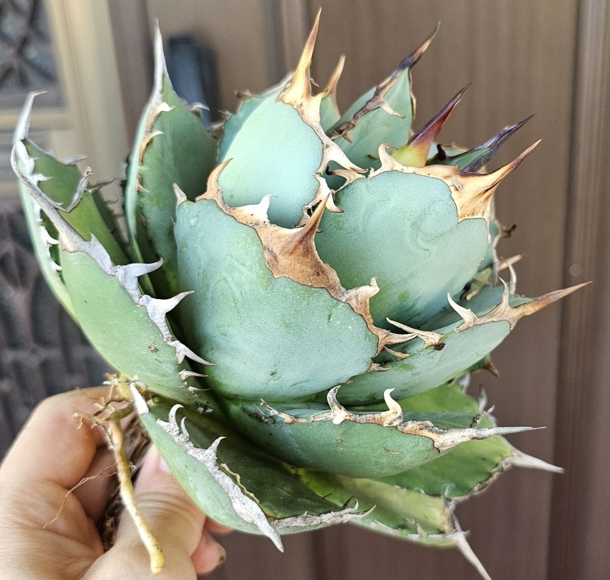 直径19cm。刺の発達がすごいです。このまま、締めきって育成して頂きたいです。屋外管理であり、多少の葉の欠け、葉の汚れ等ございます。ご了承下さい。