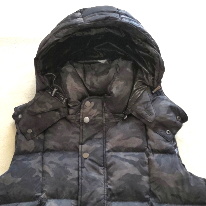 タトラスの迷彩柄ダウンベスト、フード付きでジッパーポケットつき