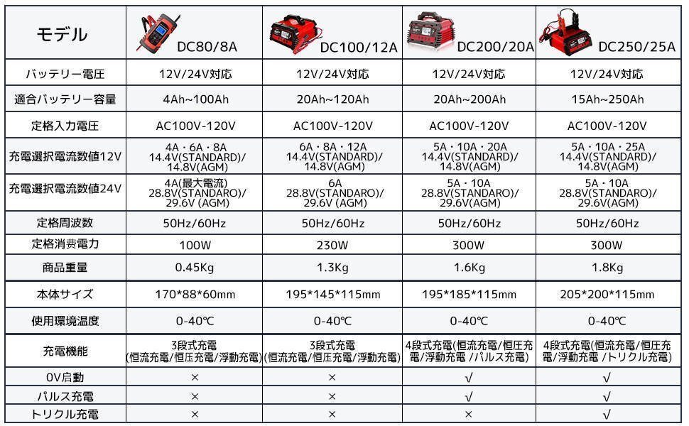 適合バッテリー:DC12V/DC24V (開放型・密閉型・AGM)鉛バッテリ