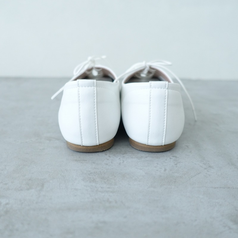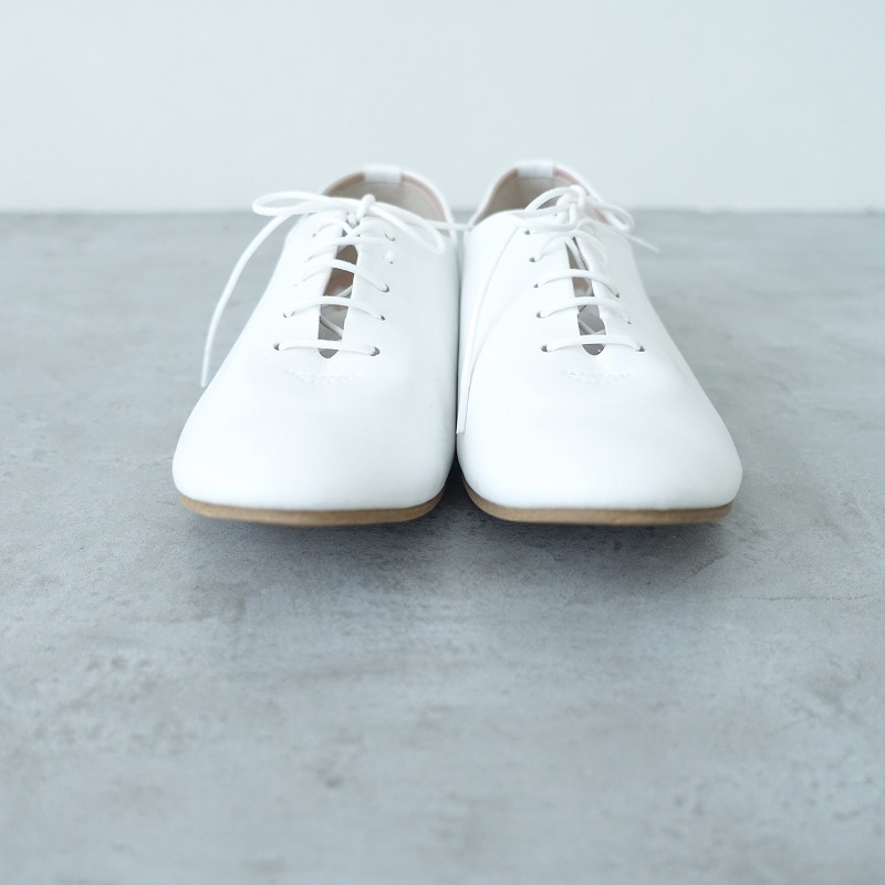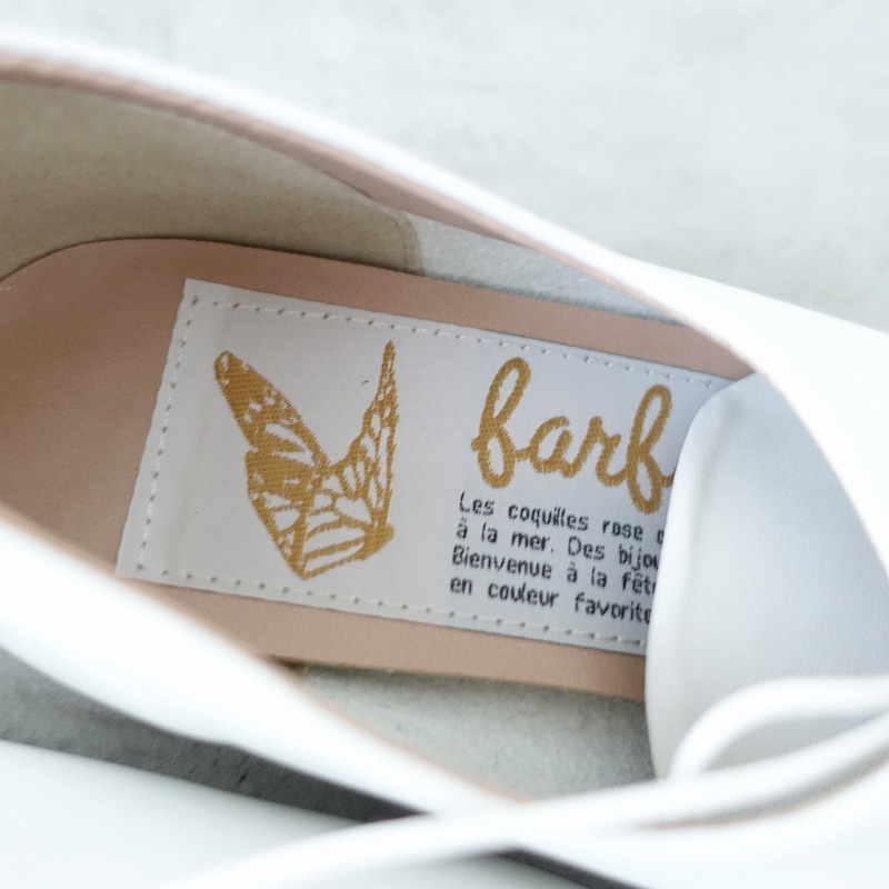 farfalleのレースアップシューズです。カラーはオフホワイトで素材は人工皮革、シューレースで着脱していただけ、インソールはクッション性がございます。